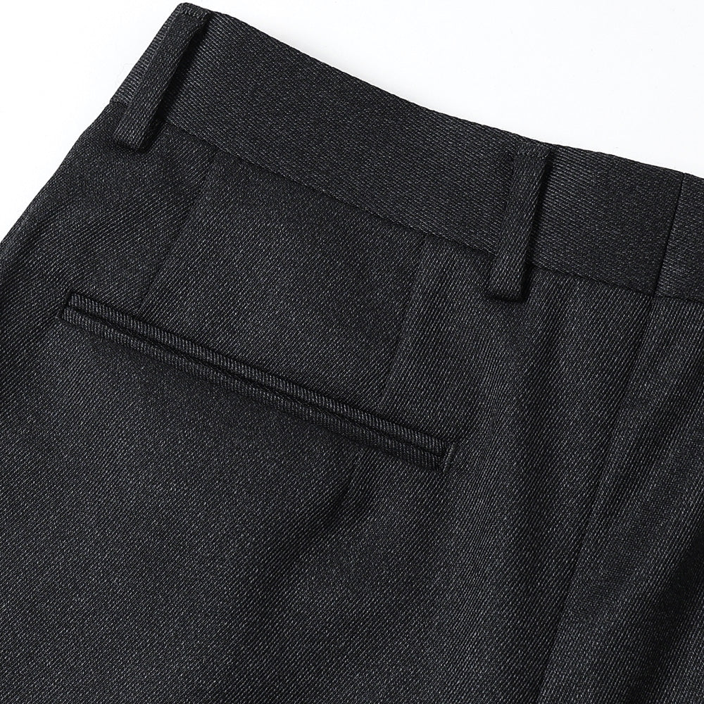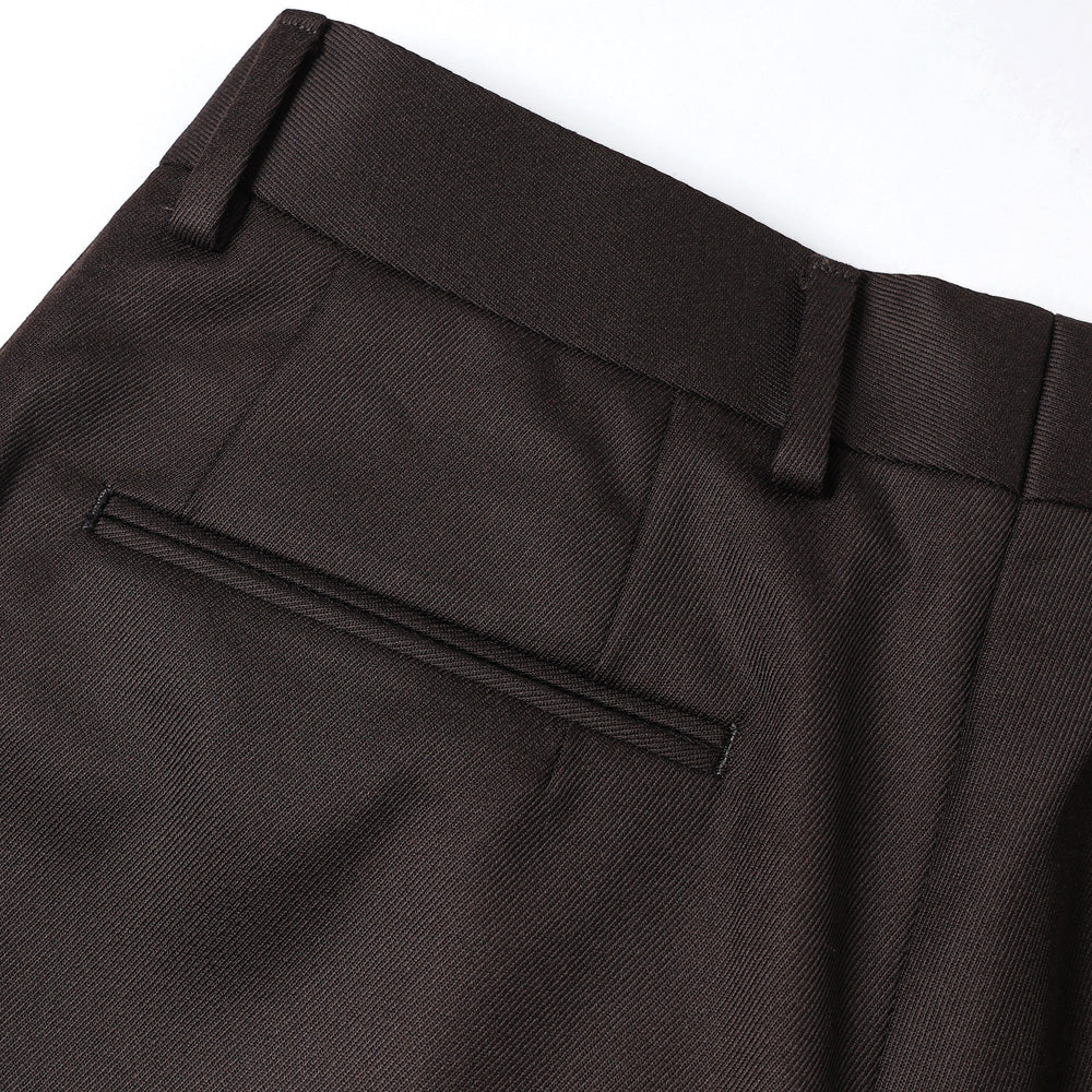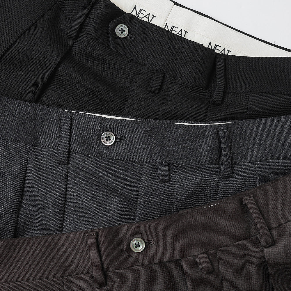 Both the warp and weft are made of medium count worsted wool 2/60, which gives the fabric a distinctive, lustrous appearance with a striking twill weave and unevenness due to the weave structure.