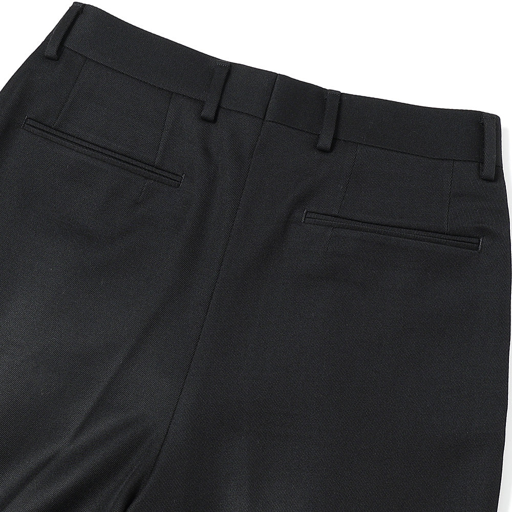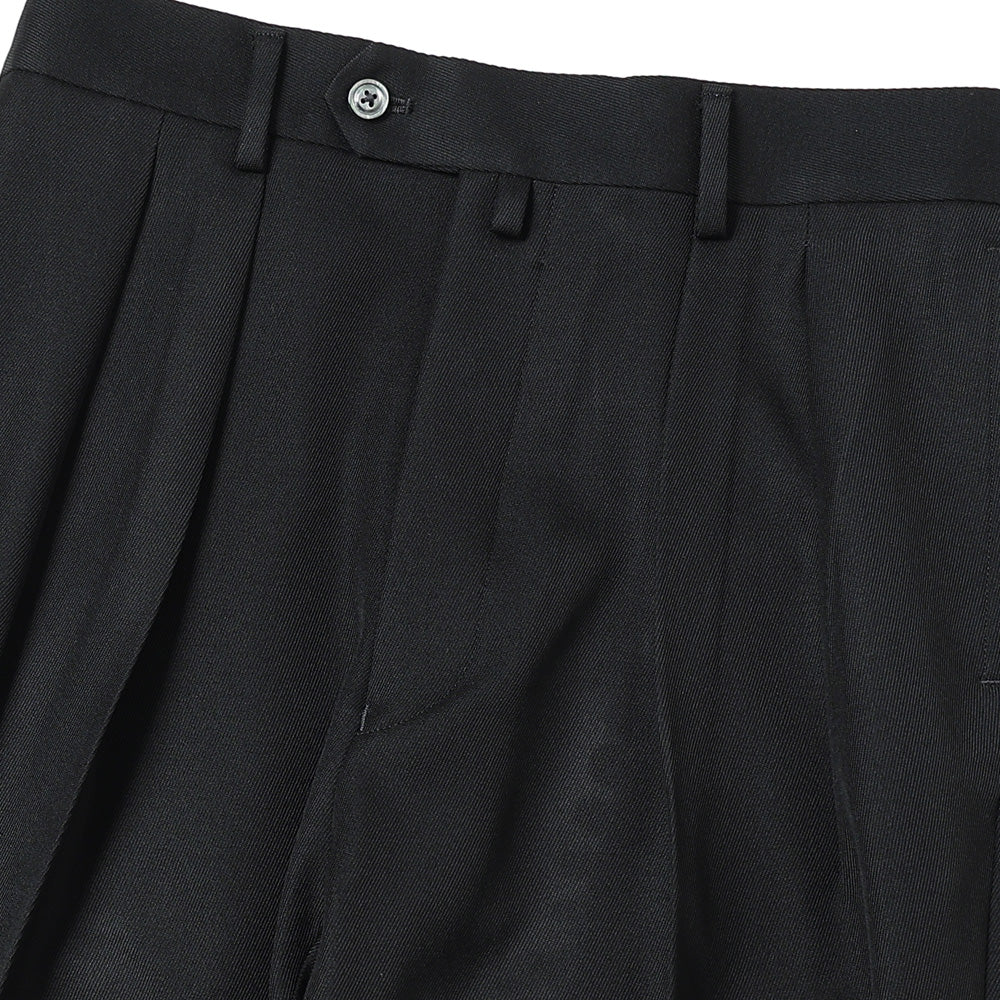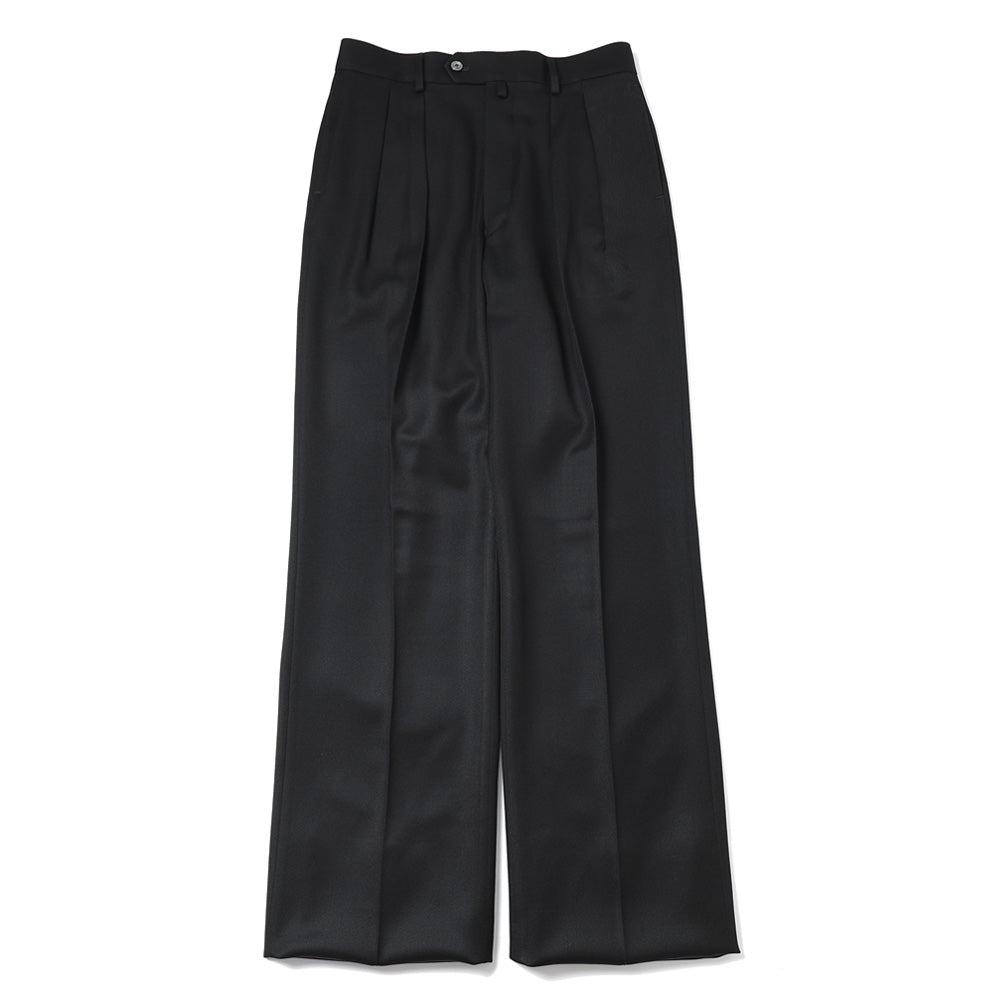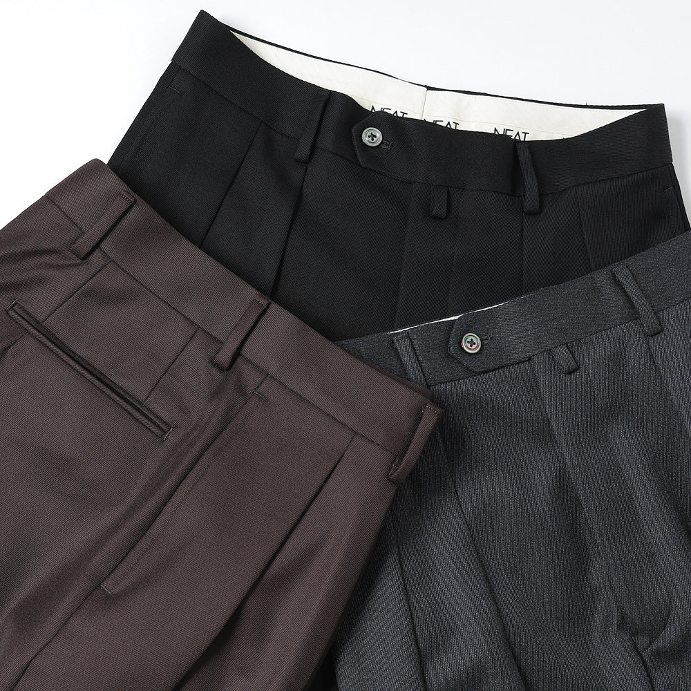 Both the warp and weft are made of medium count worsted wool 2/60, which gives the fabric a distinctive, lustrous appearance with a striking twill weave and unevenness due to the weave structure.