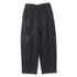 Wide tapered trousers in cotton gabardine using 80-count two-ply yarn that is very tightly twisted using a special spinning method. The material is specially processed to swell and modify the fibers, giving it a crisp touch like worsted wool and a resilient texture that is wrinkle-resistant.