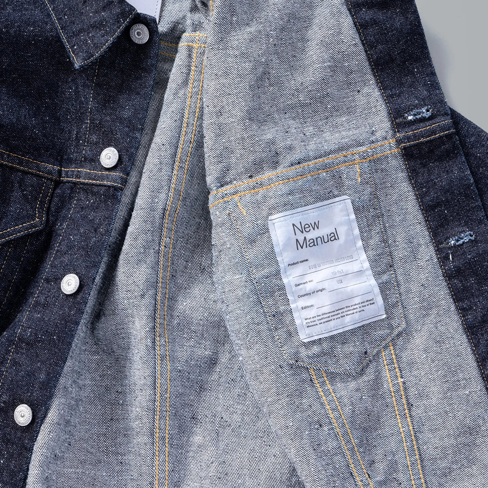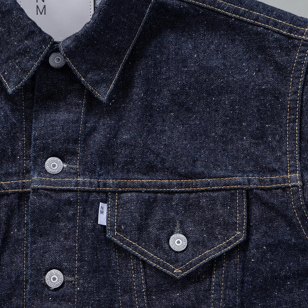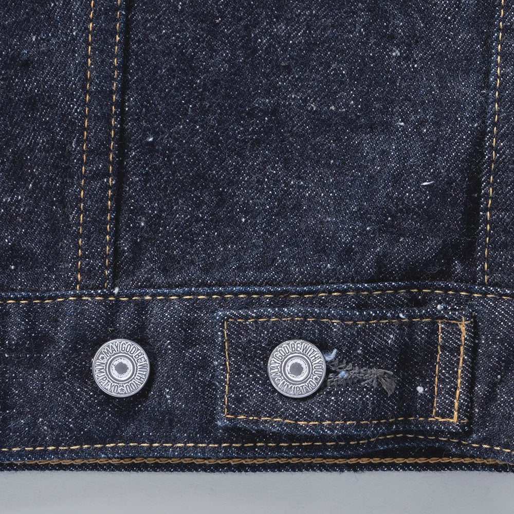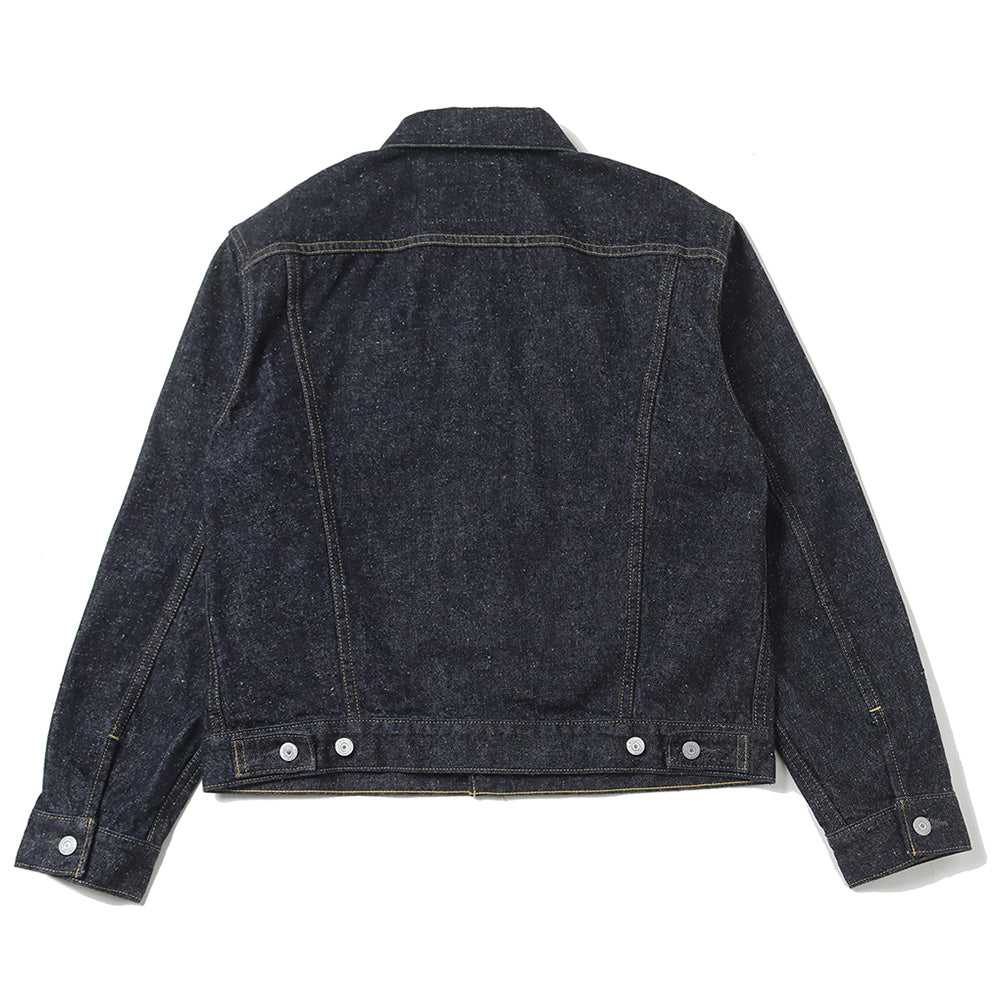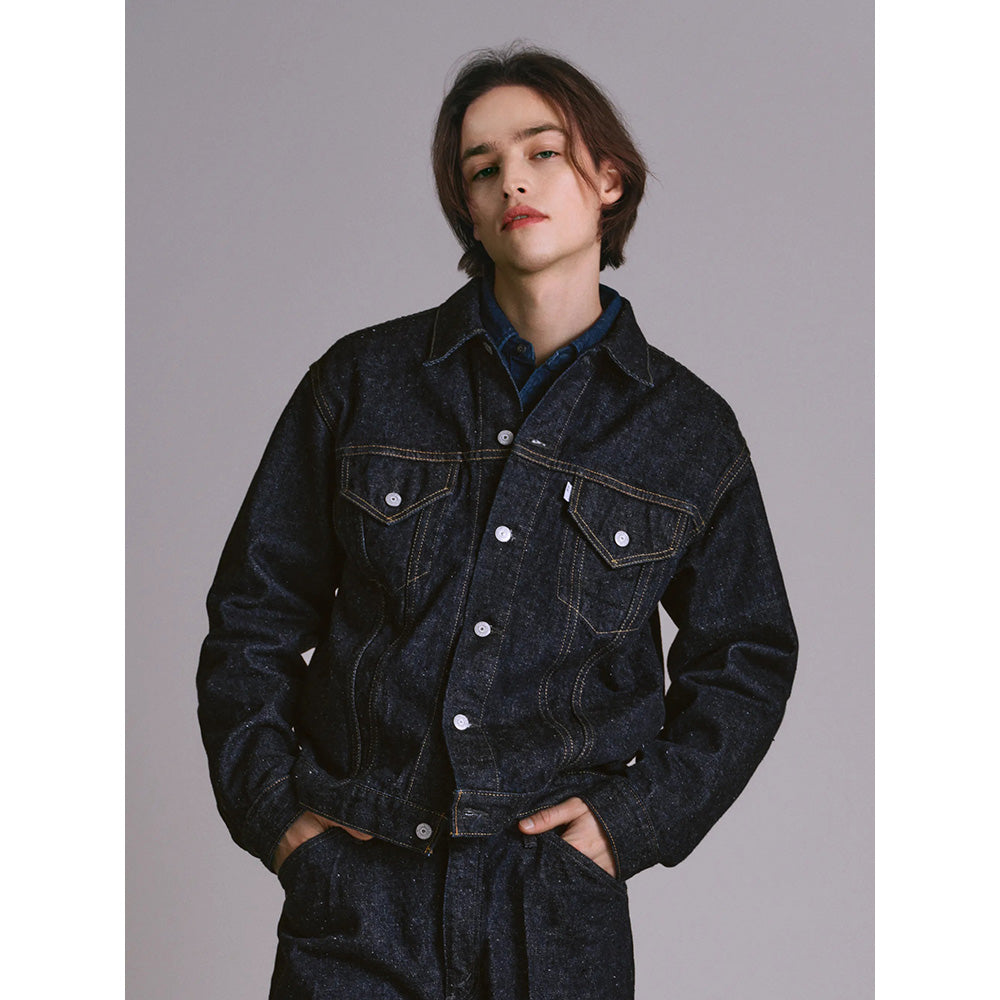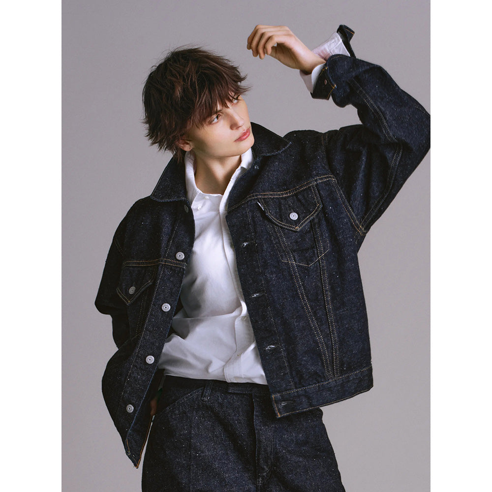 今や定番の形となった1961 年登場のデニムジャケットの中でも、着丈が長いレアなモデルをベースにしております。オリジナルの持つ絶妙な着丈は踏襲しながら、袖の長さや二の腕の太さを改善。後身頃のシェイプされたラインは緩めてボックスシルエットに近づけるなど、細部の調整を施した。ベースのジャケットは44 サイズだが、サイズ感は48サイズに近づけております。