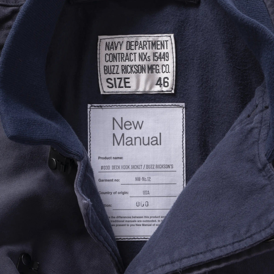 BuzzRicksonʼs*とのコラボレーション。ヴィンテージにおいて人気が高いフック使用のデッキジャケットの中でも、藤原氏所有の46サイズという希少なビッグサイズがベース。着心地を重視し、裏地はコットンネルを採用したほか、リブも本来のウールからコットンポリエステルに変更。色落ちや褪色は忠実に再現したほか、ミルスペックのラベルもオリジナルで作成。これをNewManual#030とする。 *当時のMIL SPEC (軍用規格)に基づいた生地、パーツ、縫製、フォルムに徹底的に拘り抜き、フライトジャケットの歴史と誇りを追求するブランド。
