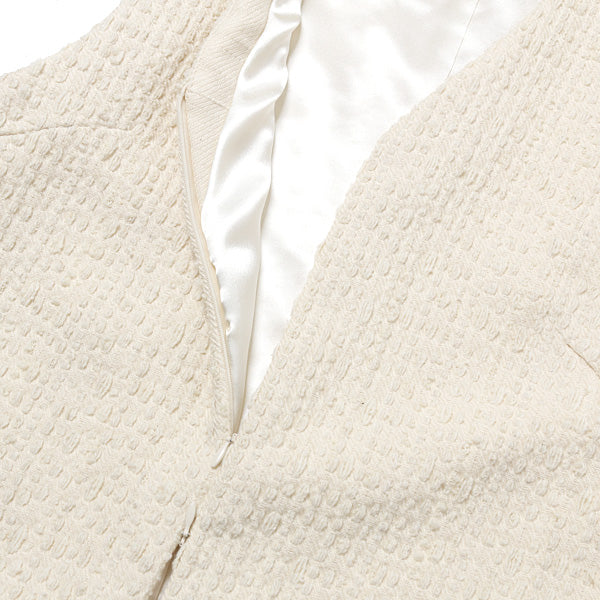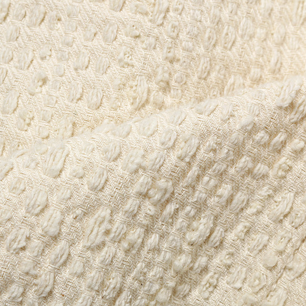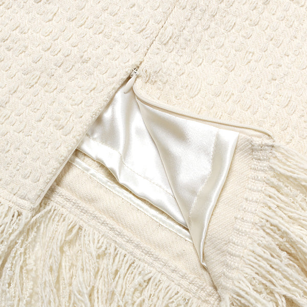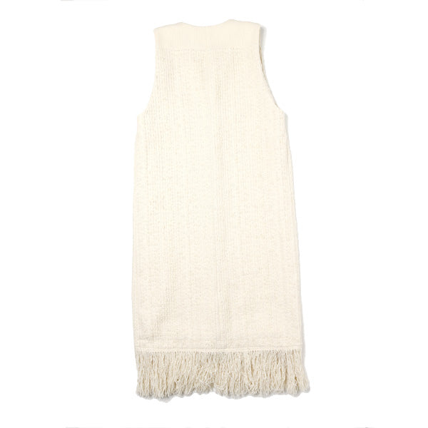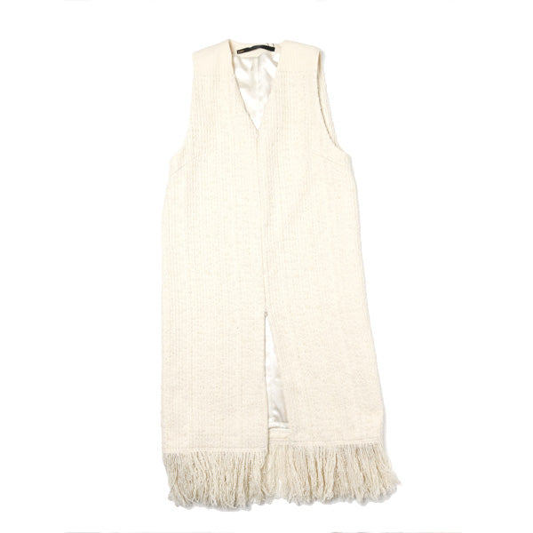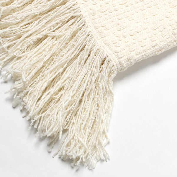 フリンジの裾口と単色ながら全体的に編み上げたれた