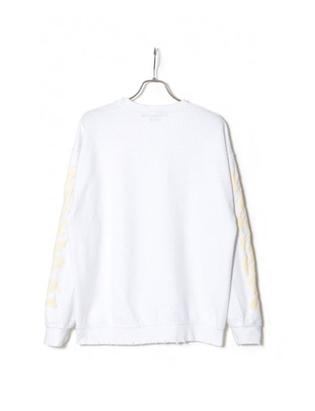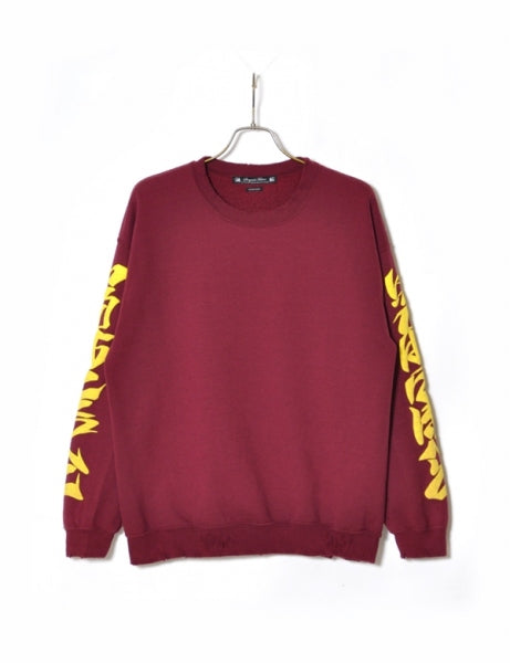 クルーネックのスウェットをダメージ加工、毛玉加工しています。