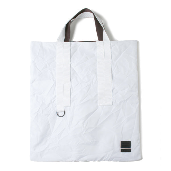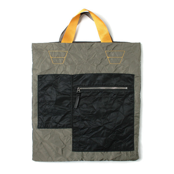 ポケットやハンドルなど、それぞれに異なるディテールの施された3枚のパネルを縫い合わせたユニークなトートバッグ。