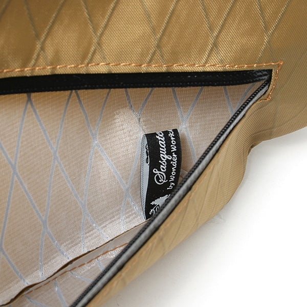 アメリカのDIMENSION-POLYANT社が開発したBLACK X-PLY(間に挟んである黒い糸のこと)を用いた防水性が非常に高い素材"XPAC"を使用して作ったポーチになります。