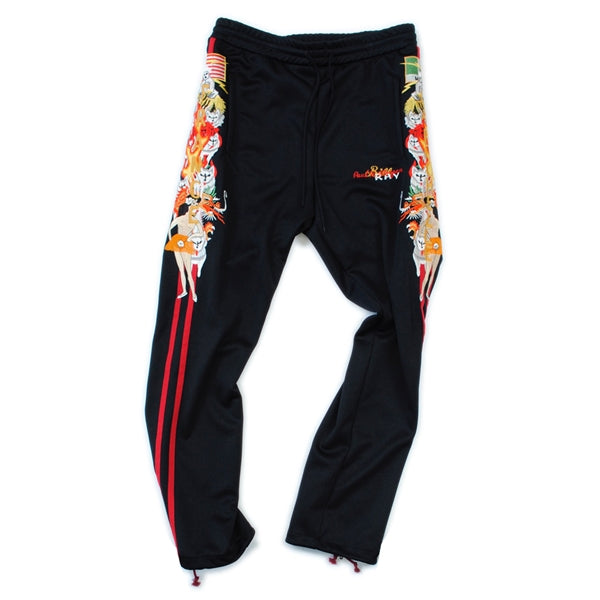 フロントに別々のビンテージのツアージャケットに刺繍してあった3人の名前を重ねて刺繍し、両脇に様々なビンテージのツアージャケットやスーベニアジャケットにあるような犬ソリ、ファイヤーパターン、龍や虎などのモチーフの刺繍を何度も何種類も重ねて刺繍をしたトラックパンツ。刺繍の針の間隔や重なる部分のアレンジによりこれだけ重なっているのに硬さを感じない技術で仕上げています。