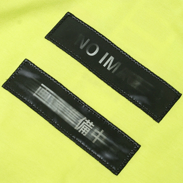 見る角度によって絵柄が変化するレンチキュラーの技術を使用したワッペンを刺繍しています。左側から見るとロゴ、真ん中から見るとブレ、右側から見ると真っ黒というようにカマボコ状の凸の見る角度でロゴが動くように見えます。背中にはレンチキュラーの仕組みの図解のイラストがプリントされています。