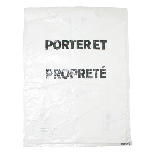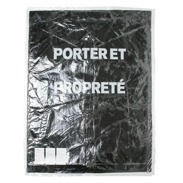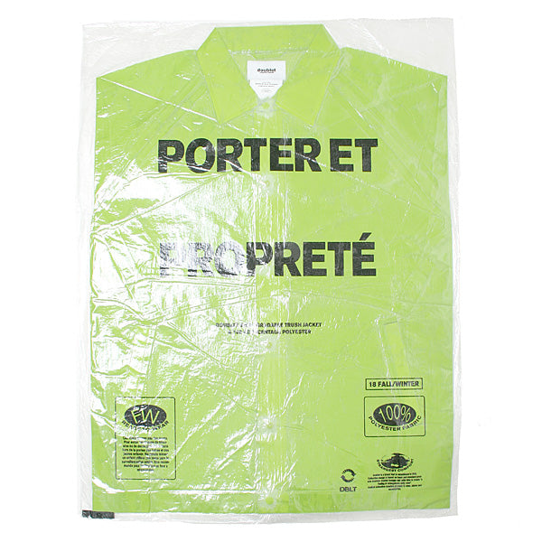 特殊な加工により、仕上がった製品をパリ街中で見かけるゴミ袋に見立てたシートにサンドイッチし、パッケージングしたデザインのコーチジャケット。ファッションの中心のパリのゴミ袋は世界一かっこいいゴミ袋だと思っています。パッケージングされたこの製品には「清潔と着用」とプリントしています。