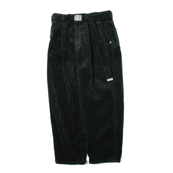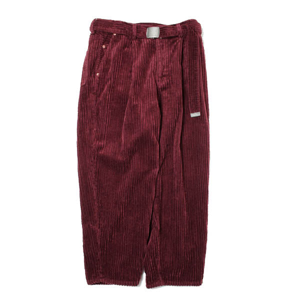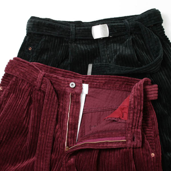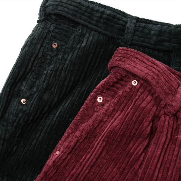 裾に向かって強いテーパードシルエットになっているオーバーサイズのコーデュロイパンツ。ウエストもオーバーサイズで仕上げていますので、付属の共生地のベルトで締めてハイウエストにも腰履きにも、その時の気分に合わせての着こなしが出来ます。