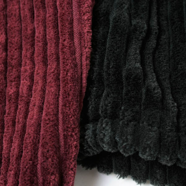 極太の畝のコーデュロイ生地で作った製品を、熱で縮ませ、加工によって着古したような雰囲気に仕上げています。他にはないシルエット感や肉感はあるのに柔らかい着心地を楽しんでもらえたらと思います。