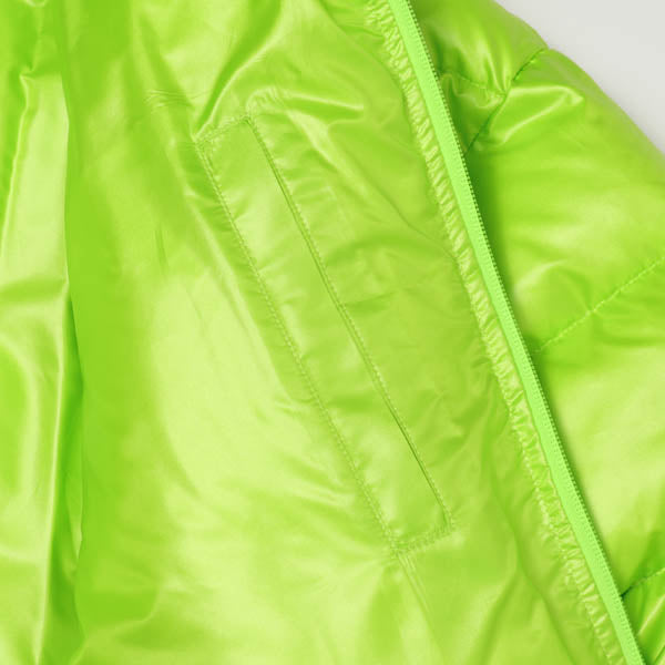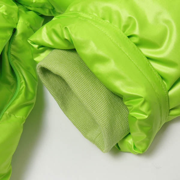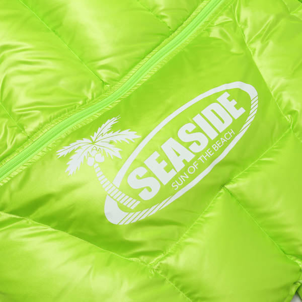 フローティングマット(海に浮かべて寝るタイプの浮き輪)を体に巻きつけたように見えるようにダウンパックの仕切りを区切っています。色展開もよく見かける浮き輪やフローティングマットの色合いにして、リアリティを出しています。このダウンジャケットを着用し、海に入ると水を含み沈んでしまうので注意してください。