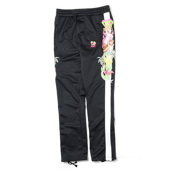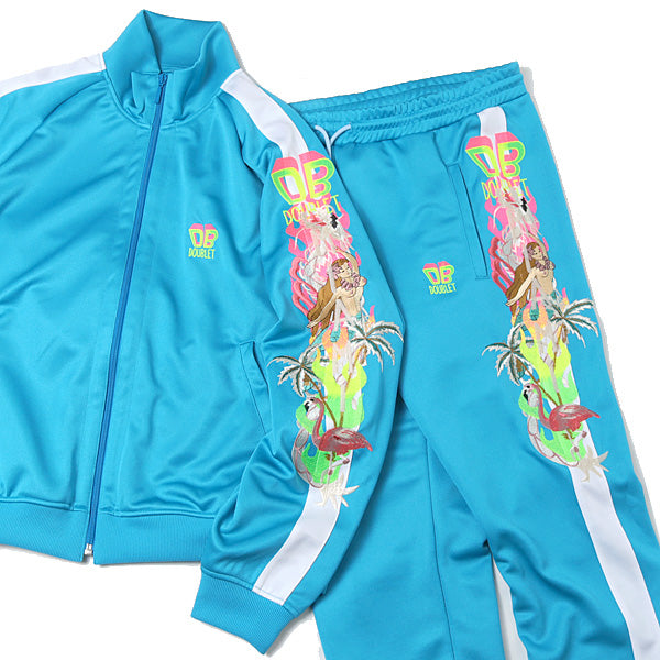 フロントにDOUBLETのDとBを3Dのグラフィックで刺繍し、袖に様々なビンテージのツアージャケットやスーベニアジャケットにあるようなファイヤーパターン、龍や虎などのモチーフの刺繍を何度も何種類も重ねて刺繍を施したトラックパンツ。