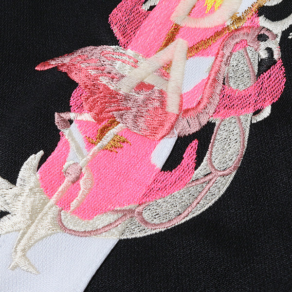 刺繍糸も光沢のあるレーヨン糸、蛍光色のポリエステル糸をモチーフにより使い分けることによって、彩度の違いにより立体的に見えるようにしています。蛍光糸の刺繍によりスポーツの中に、80sビーチカルチャーを感じる表情に仕上がっています。