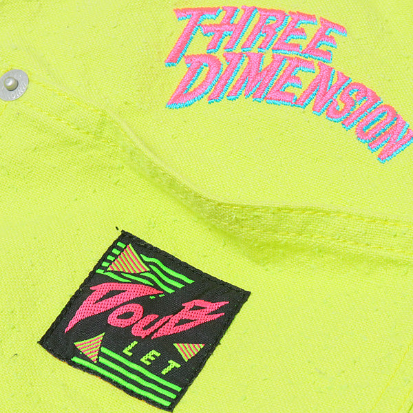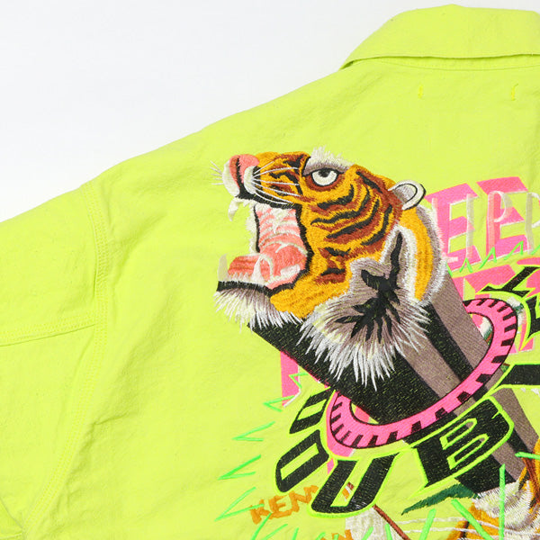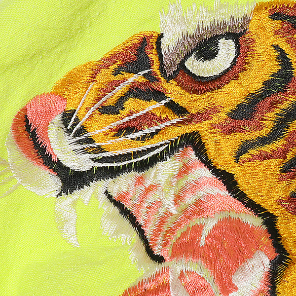 背中にスーベニアジャケットのような刺繍を光沢のあるレーヨン糸、蛍光色のポリエステル糸をモチーフにより使い分けることによって、彩度の違いにより立体的に見えるようにして、グラフィック自体も虎の顔が飛び出しているような3D感にしています。蛍光糸の刺繍により、80sビーチカルチャーを感じる表情に仕上がっています。