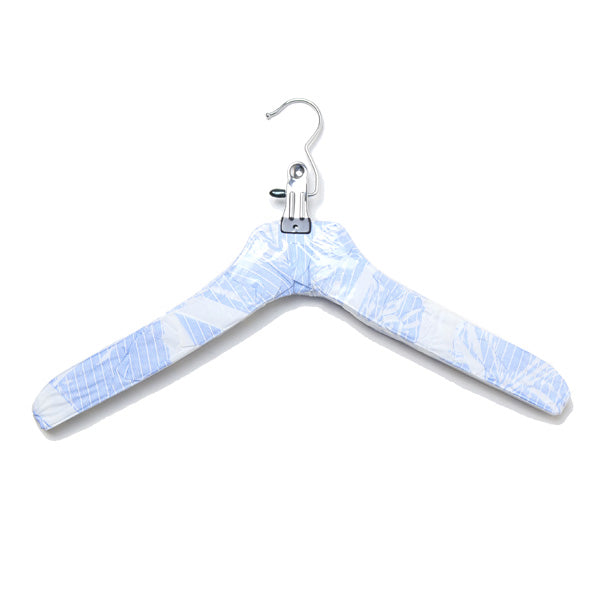 ハンガー型の型にシャツを畳んで圧力でプレスをかけることにより、形状をハンガーの形に固定しています。