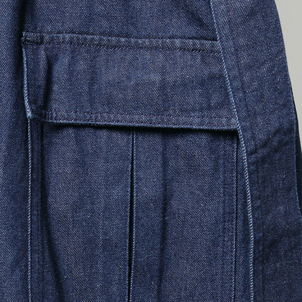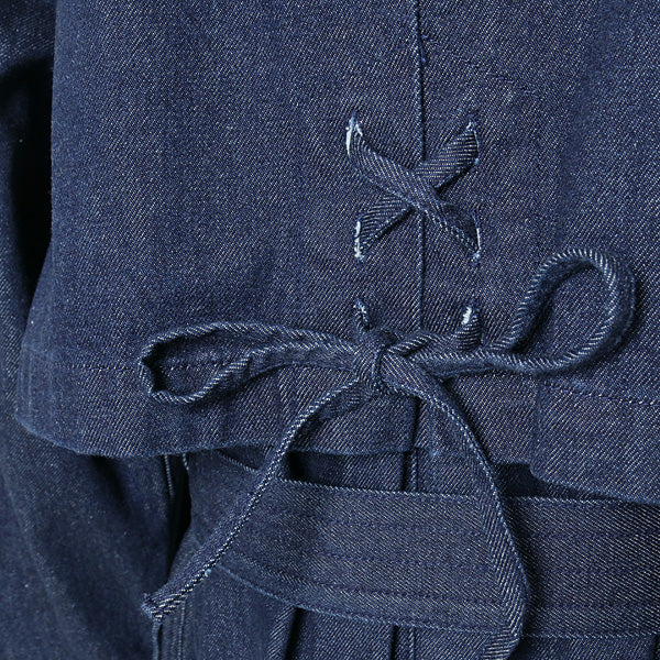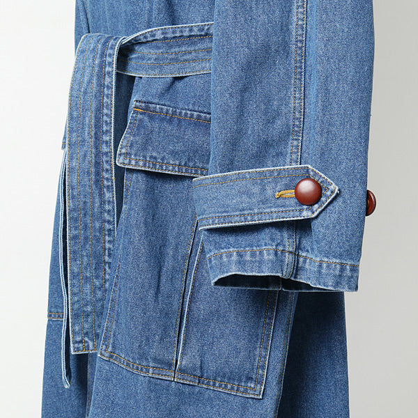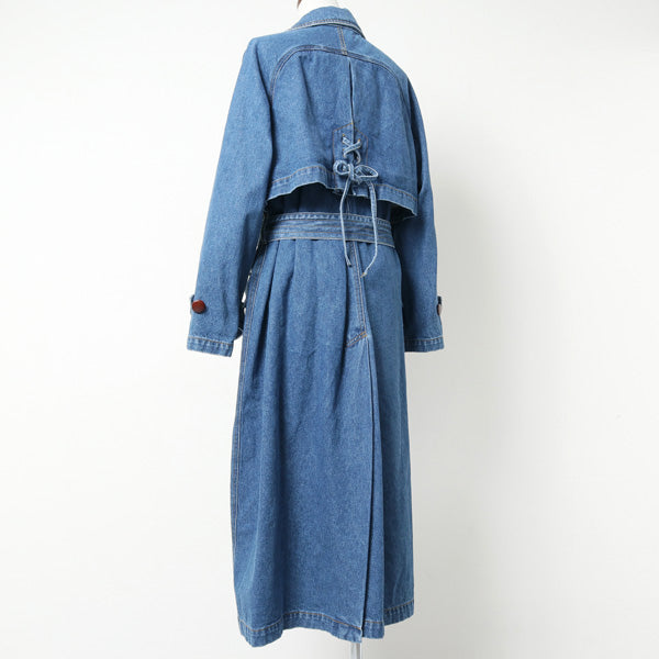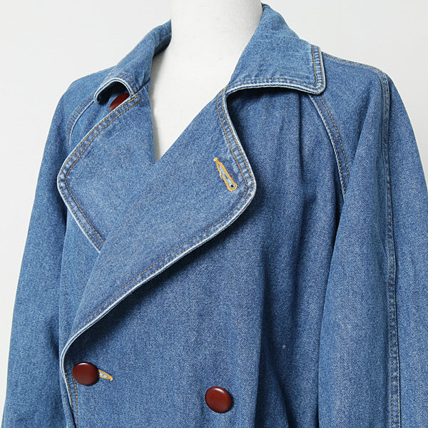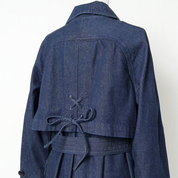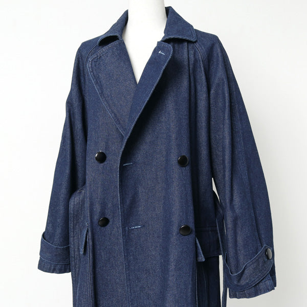 デニム素材をたっぷりと使い、トレンチの要素を加えたライトアウター。