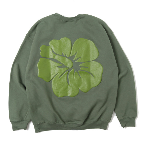 バックに特大サイズのハイビスカスの発泡プリントが施されたクルーネックスウェット。