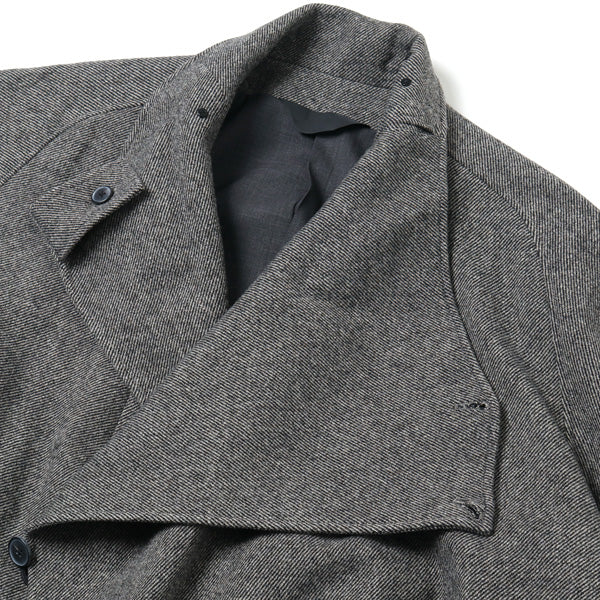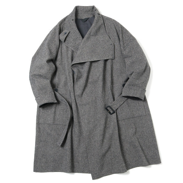 マントを羽織っているような見頃のボリュームに対し、コートらしいアウトラインが特徴。素材毎に変わるドレープの表情を楽しんで頂きたい1着です。