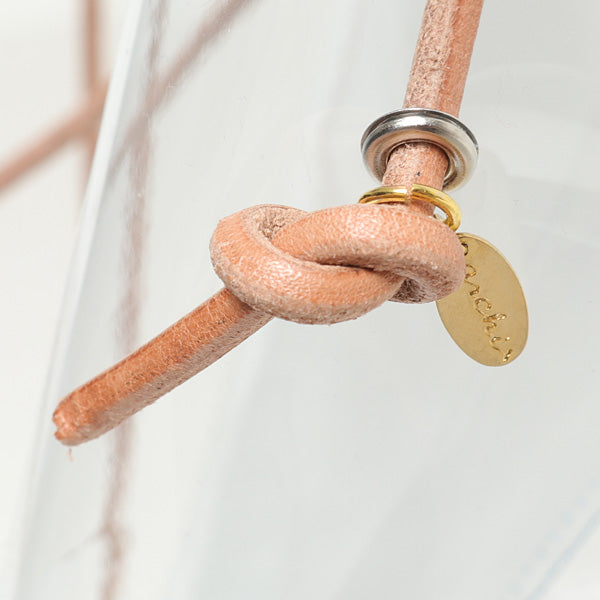 ビニール素材と革ひもを使い、素朴ながら繊細さも感じる