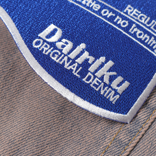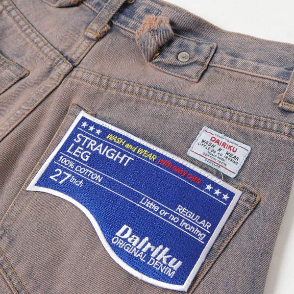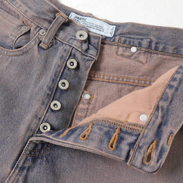 インディゴ×ホワイトのデニム生地に洗いをかけカーキとピンクに染めております。