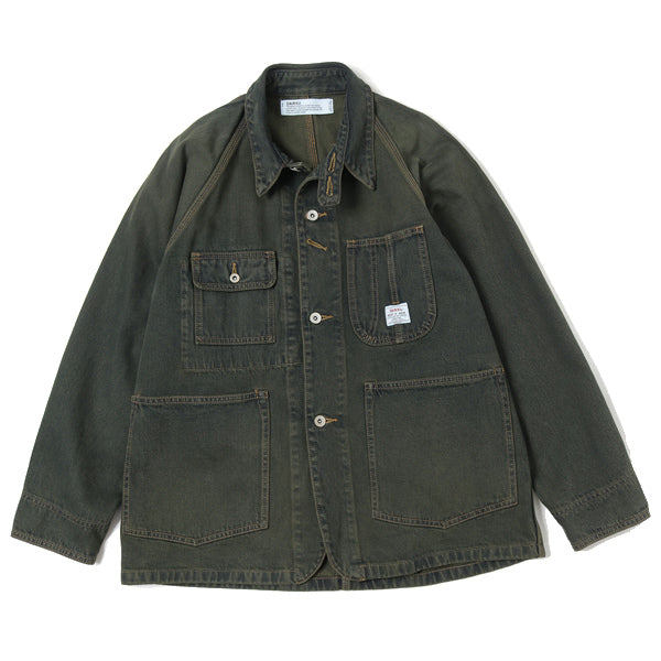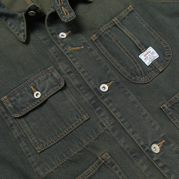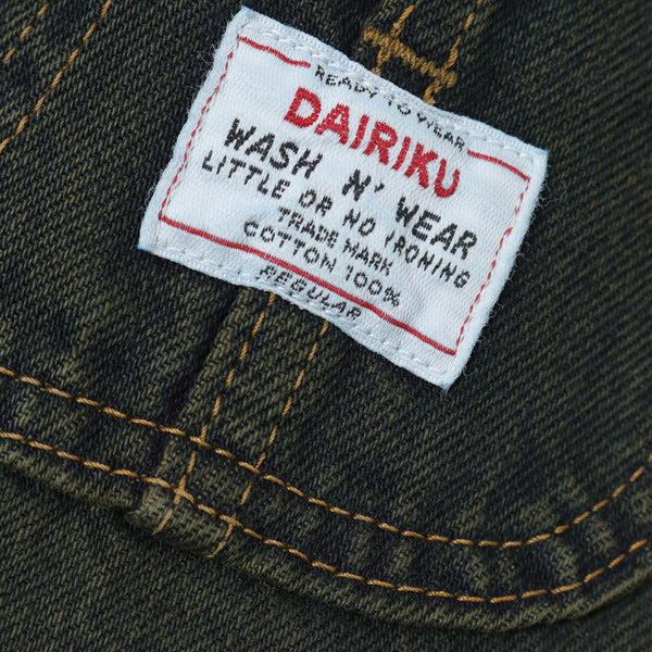 インディゴ×ホワイトのデニム生地に洗いをかけカーキとピンクに染めております。