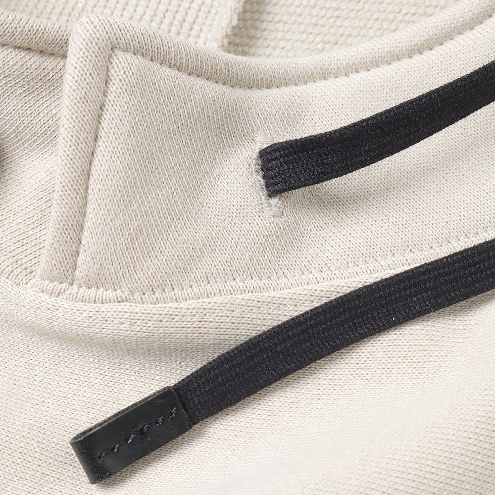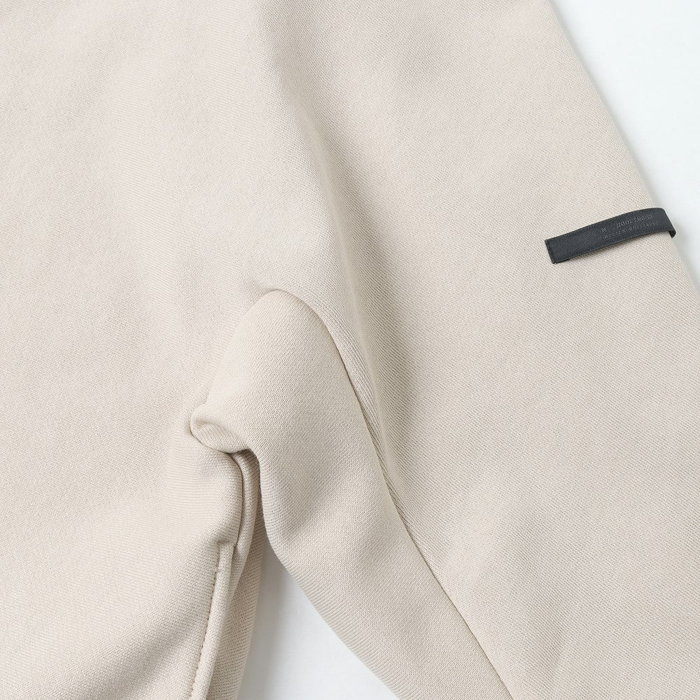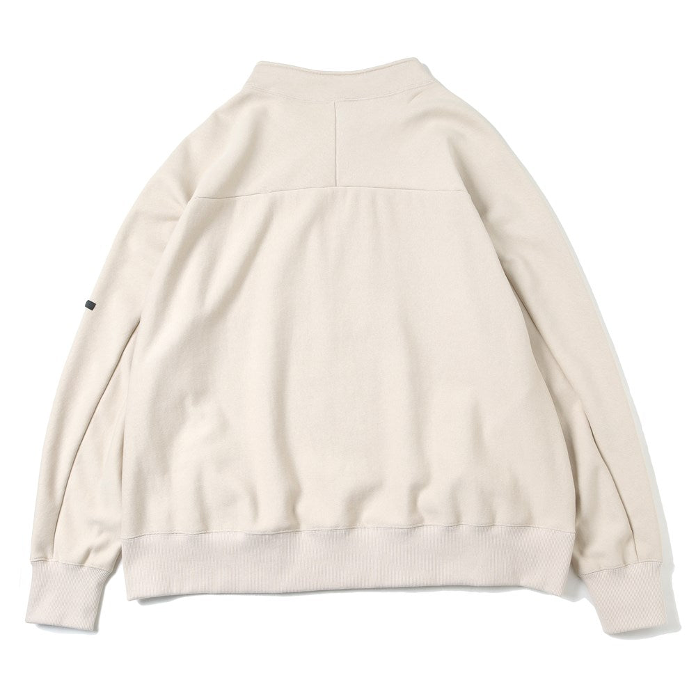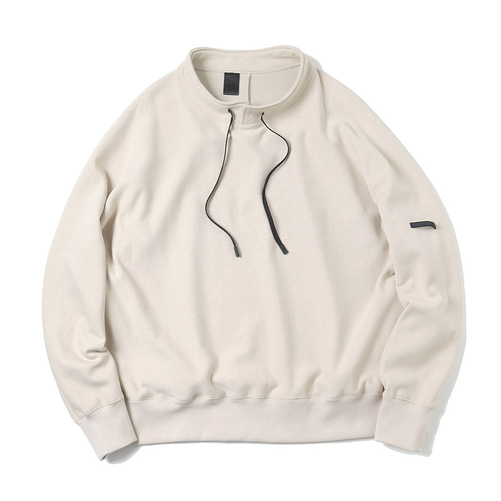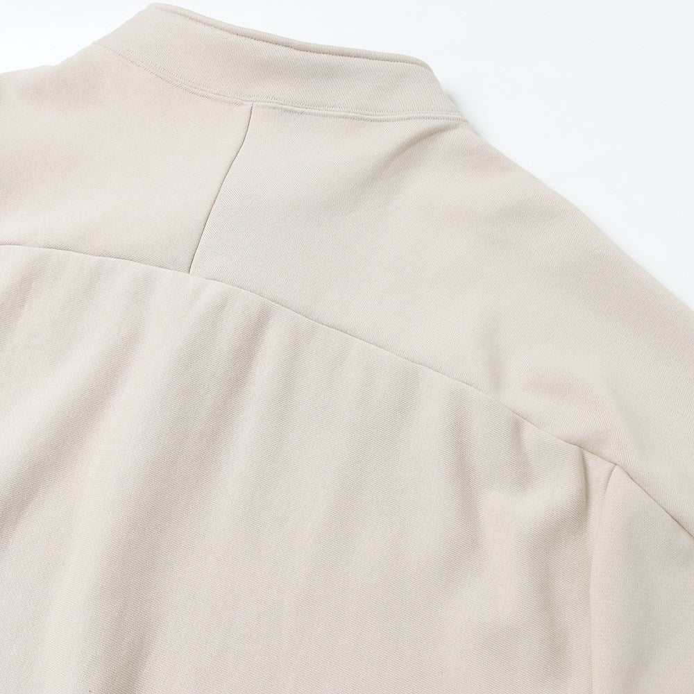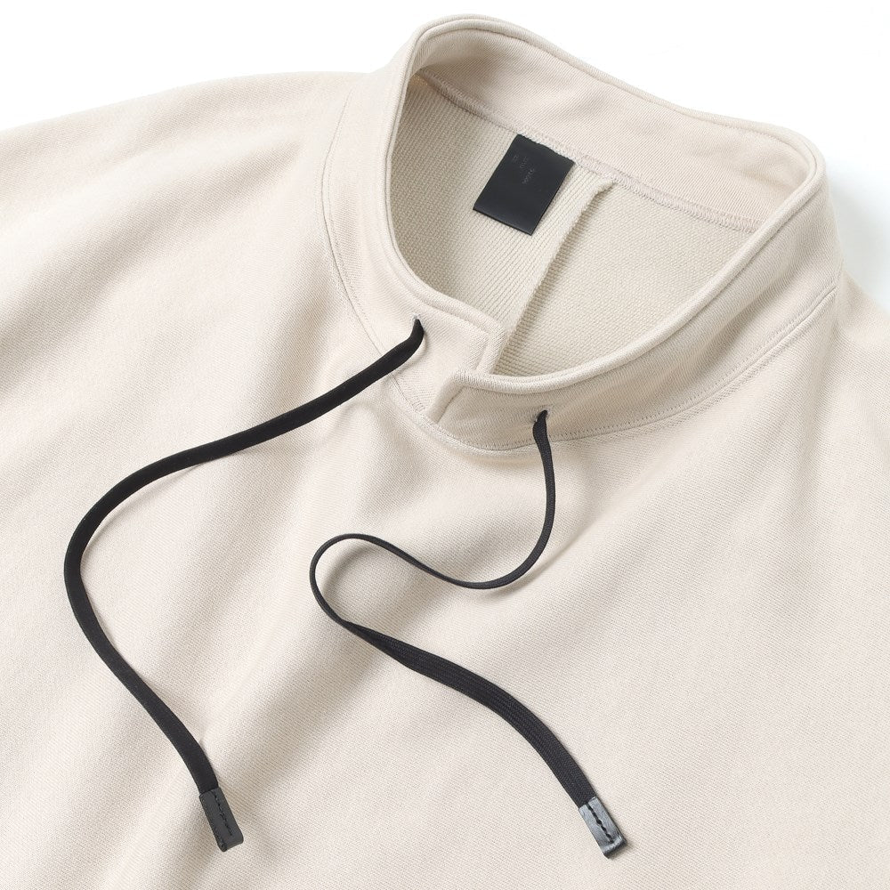 ・プルオーバーのフーディから着想を得た、スタンドカラーのプルオーバー。・身体に沿うように立体裁断でパターンメイクし、肩に縫い目がなく丸みのあるフォルムのスリーブ。プルオーバーのフーディの首元をカットして生まれるディテールを落とし込んだデザイン。両端にレザーを配したオリジナルスピンドルで首元のアレンジが可能。袖リブ、裾は締め付けのない自然なテンションのリブ仕様。シームポケット付き。