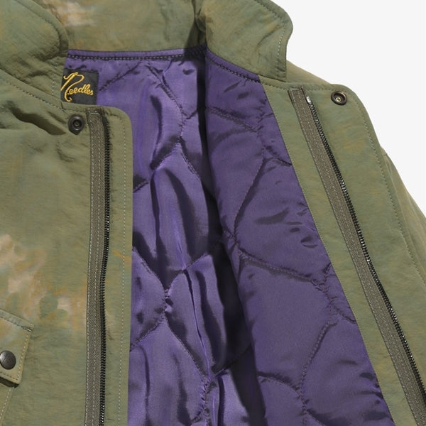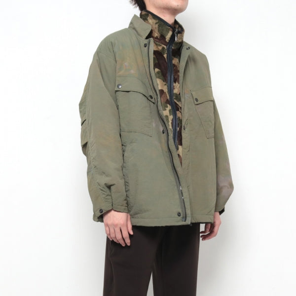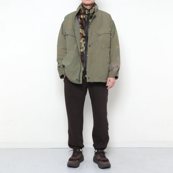 ミリタリージャケットをあえてムラ感のある染めを施したナイロンタッサーで制作した一着。