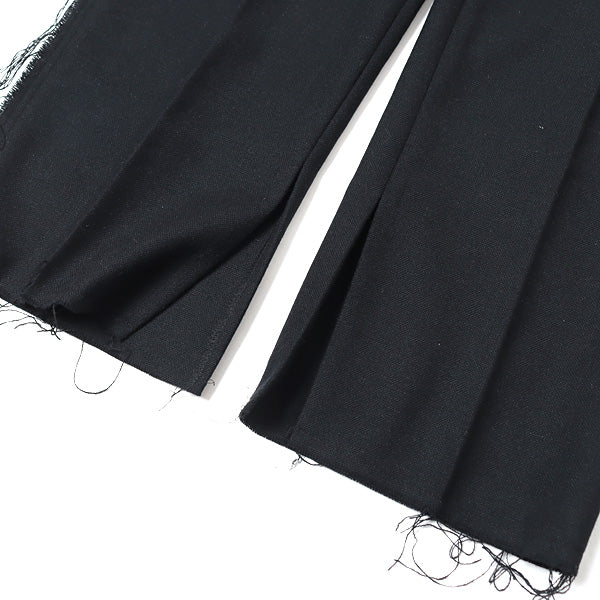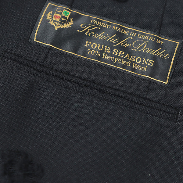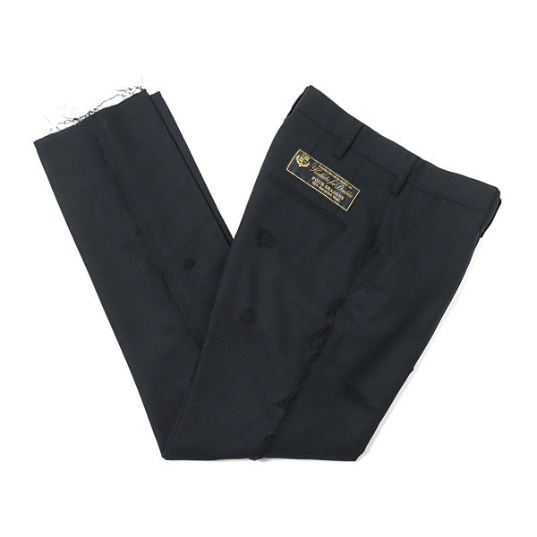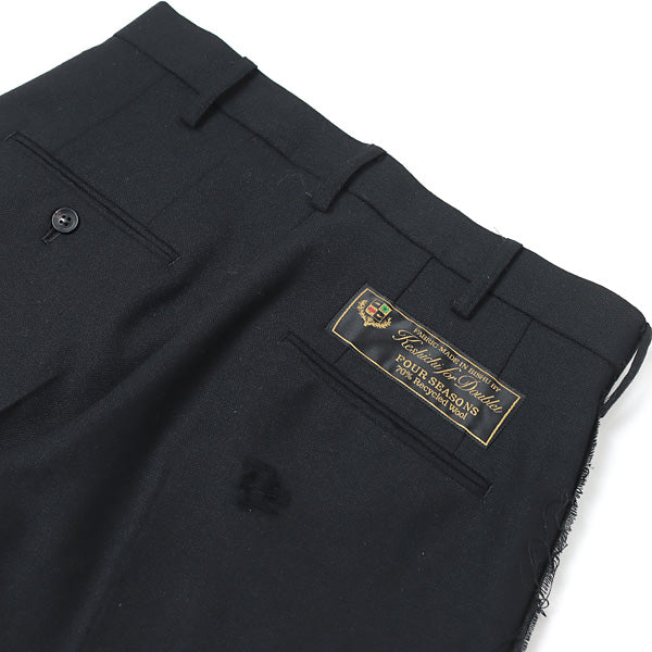 尾州産地で50年以上に渡って紡がれてきた古着や裁断クズを粉々にして再び羊毛として蘇らせる繊維再生サイクルである毛七(ウールが7割、その他繊維が3割の混紡繊維なのでそう呼ばれた)の技術で作成したリサイクルウールのスラックス。薄く織った生地を二重仕立てにし、表面の生地のみヴィンテージのような破けやユーズド感を施しています。