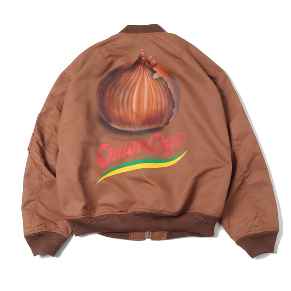 フライトジャケットにはノーズアートのピンナップガールなどが背中にペイントされますが、この服にはオニオンスープの素のパッケージのようなペイントが施されています。戦争から生まれたフライトジャケットの形状をしていますが、この服は食べ物から生まれました。