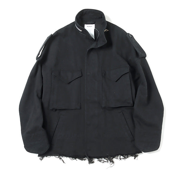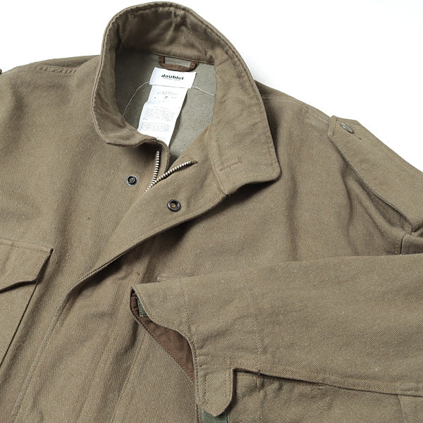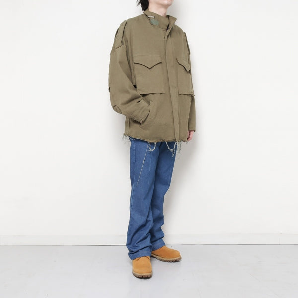 蛾が抜け出した後の繭から紡ぎとった精製しないままのローシルクを緯糸に使用することにより、絹の柔らかさがありながらネップ感などのカジュアル感を兼ね備えたオリジナルのシルクツイル生地を製品で染めたオーバーサイズの、カットオフしたフィールドジャケットです。
