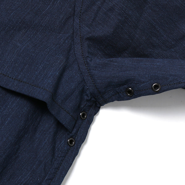 経糸にロープ染色した40番手のインディゴヤーンを緯糸に特殊な加工を施しオイリー感をつけたナイロン糸を用いて織った生地が特徴的。