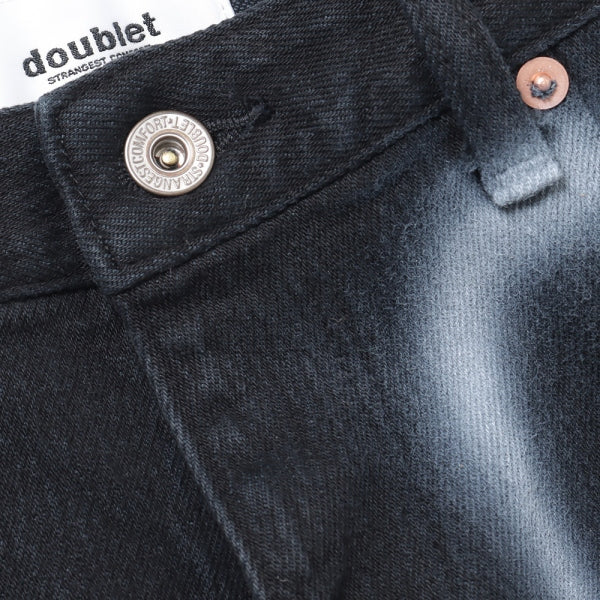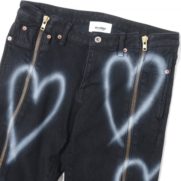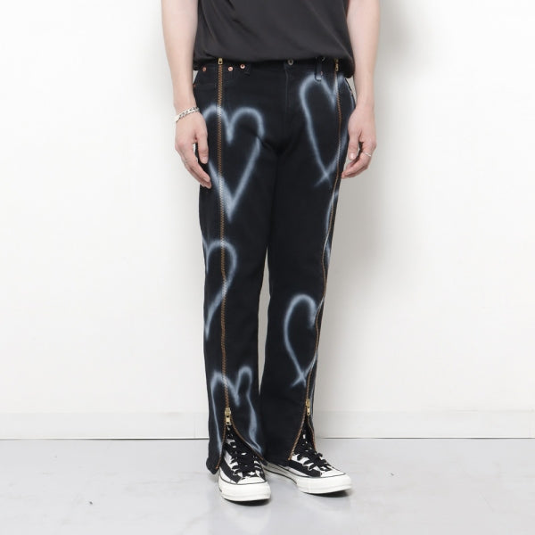 古着のジーンズなどを回収し、リベットやファスナーをはずして粉砕してから紡績糸にしたリサイクルデニム糸とオーガニックコットン糸の混紡糸を緯糸にして、経糸はインディゴや黒染めのコットン糸で織った古着デニムの混率が22%のデニム生地にユーズド加工を施しハンドペイントでハートを描いたデニムパンツ。