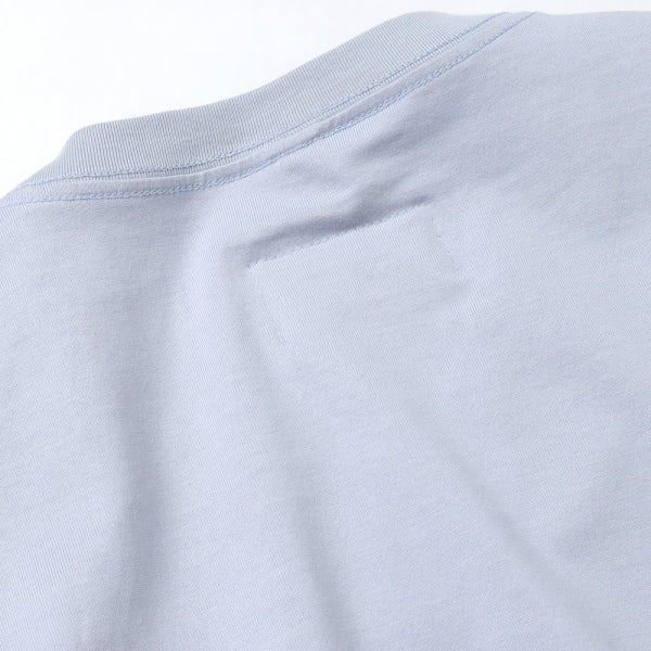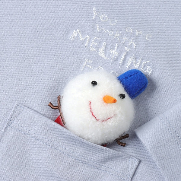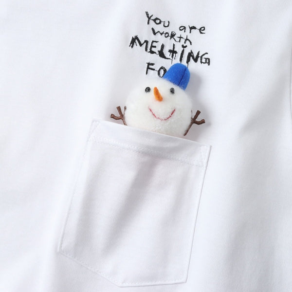 胸ポケットに雪だるまの人形が入っているように見えるTシャツ。