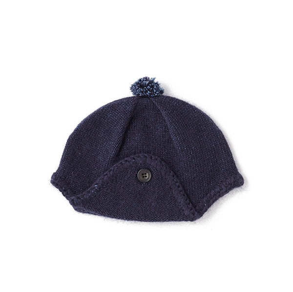 インディゴ染めしたコットン糸とモヘアウールの糸をツイストして編んだキャップになります。イヤーガード付きなので、その時の気分で垂らしても上げてもご使用頂けます。