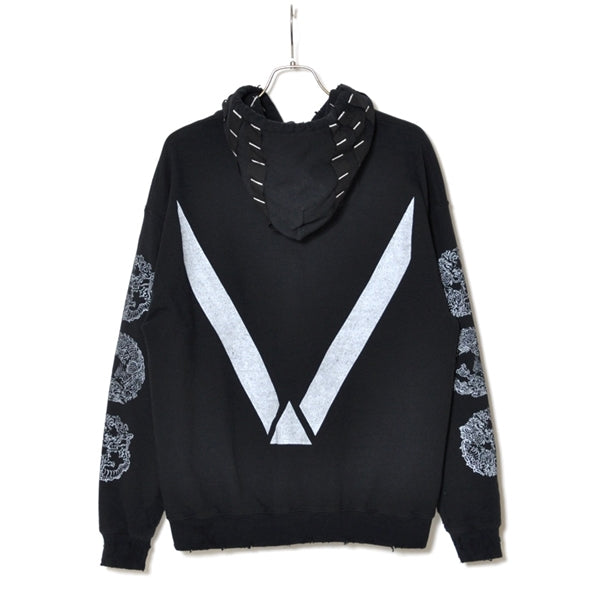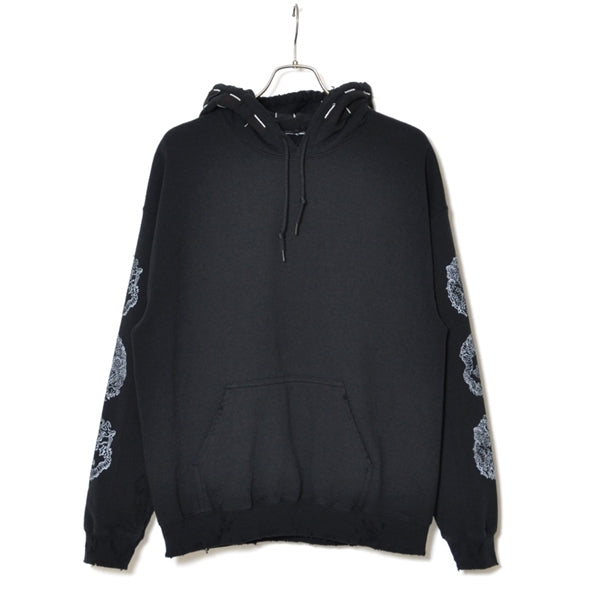 激しいダメージ加工、毛玉加工を施したスウェットパーカー。