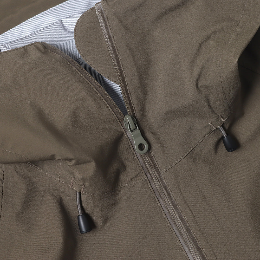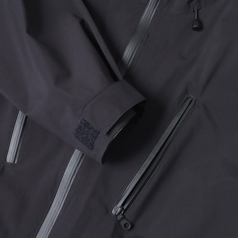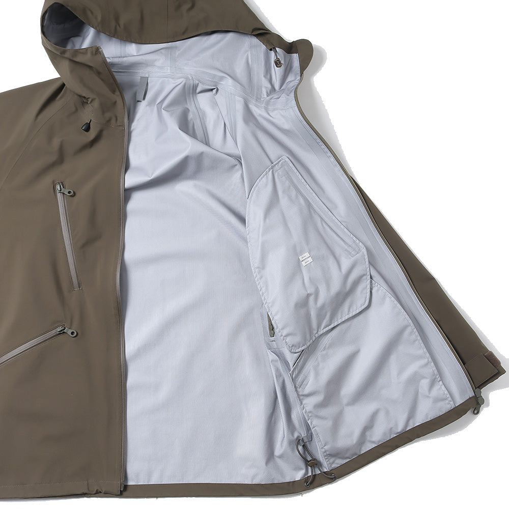 耐水圧:20000 ㎜ 透湿度:20000g/m2/24h 3 レイヤー。ソフトで適度なストレッチ性がある、高耐水・高透湿性を持ち合わせた生地です。シームテープ、止水ファスナーを使用しています。