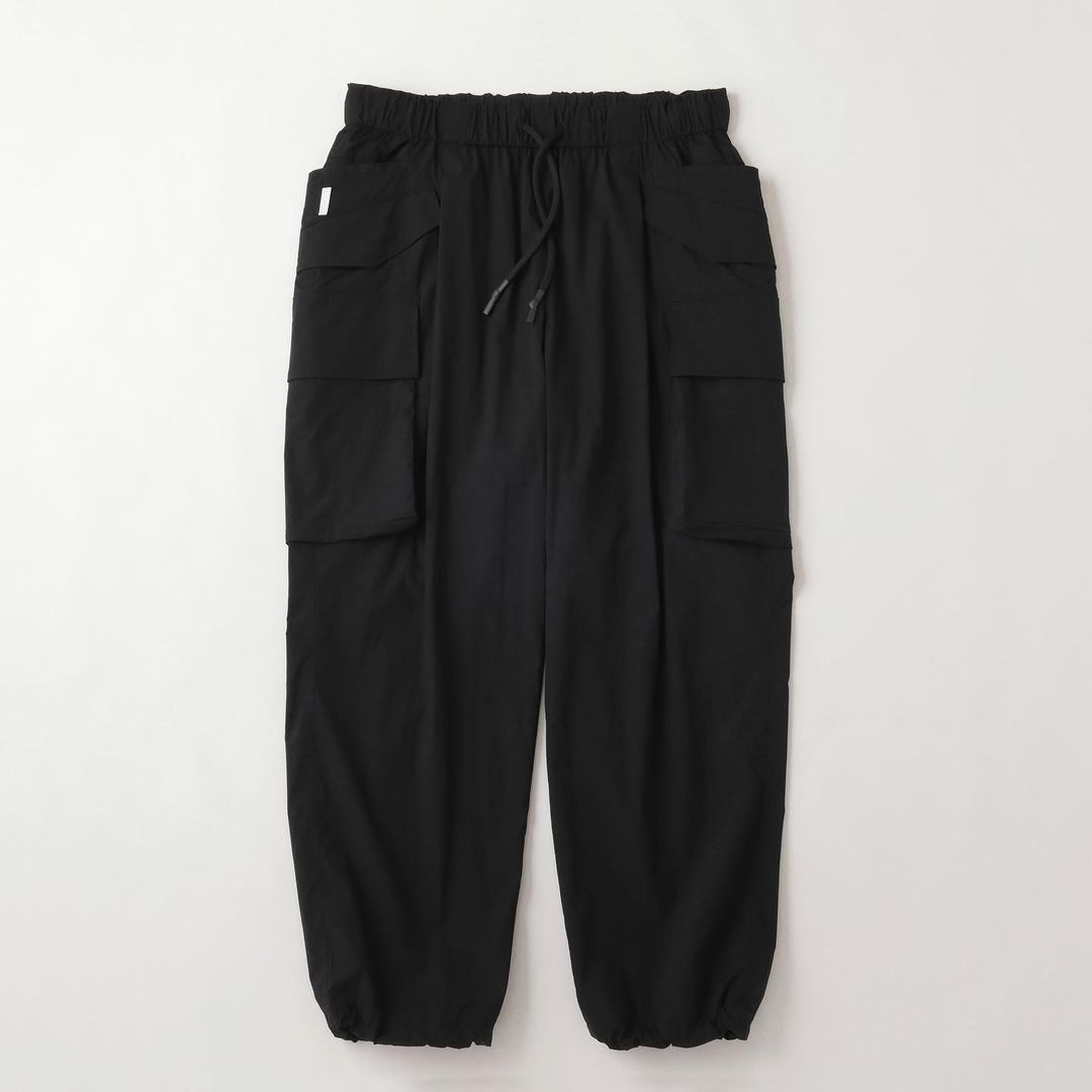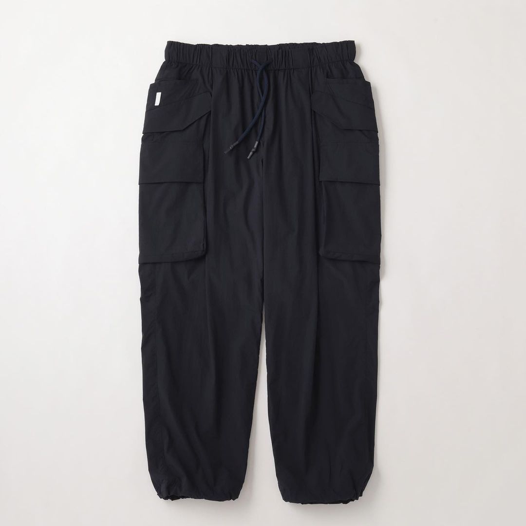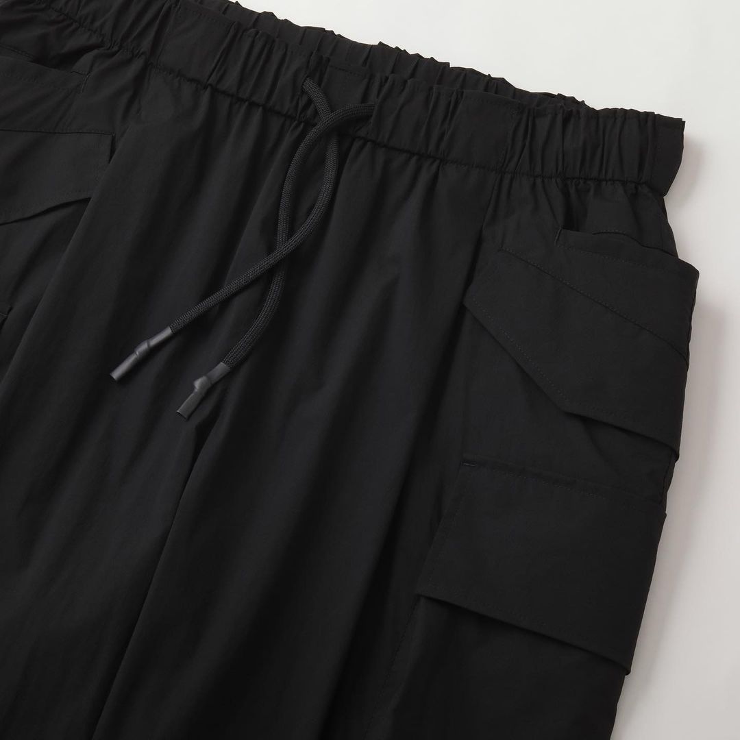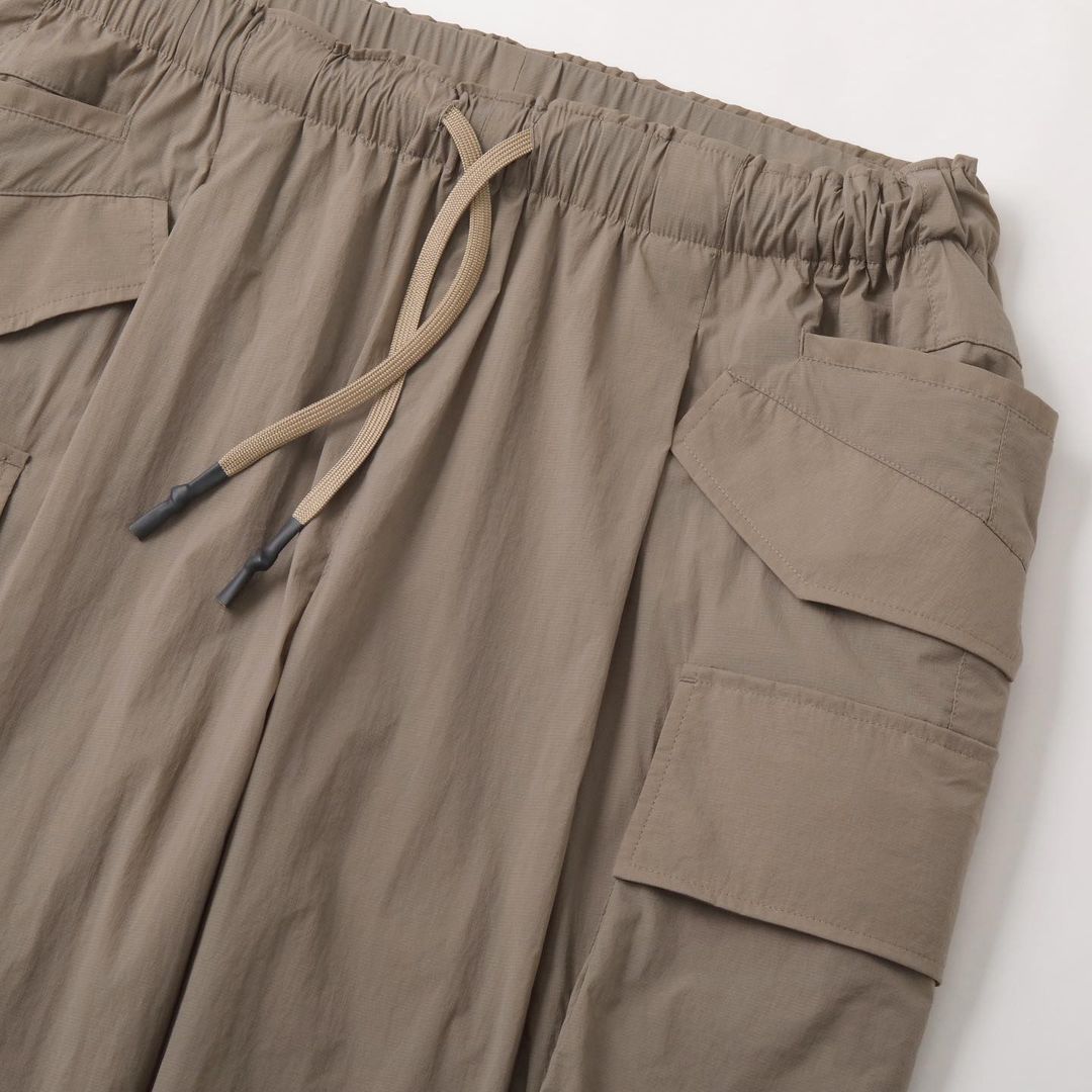 SFC TAPERED EASY PANTSにカーゴポケットを付け、をさらに腰回りを大きく、裾幅を広く、ワイドなシルエットにアレンジしたワイドカーゴパンツ。裾のアジャスター付きドローコードを絞ることでシルエットのアレンジも可能。素材は20Dのリップストップナイロンを使った、超軽量・強撥水・ハイストレッチ生地を使用。細い糸を使用しながらも高密度であるため、独特なハリ感・上質な見え方が特徴の素材です。裏地には高多汗処理機能を持ち、肌面を快適に保つメッシュ素材を使用。