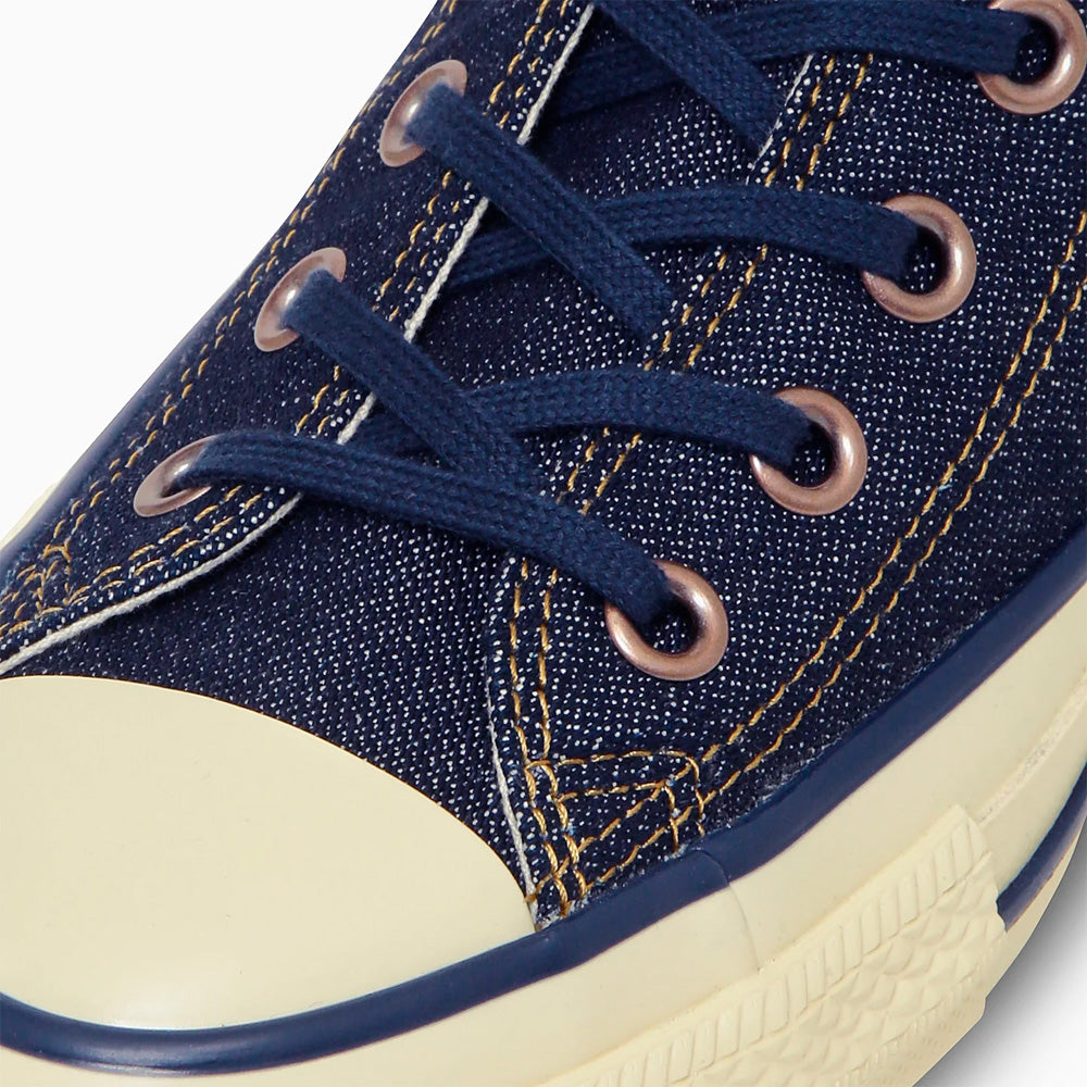 国産のカイハラデニムのアッパーに、裏使いした踵紐、通称「ロープロゴ」のピスネームやレザーのアンクルパッチ、アンティークカッパーのハトメ、オレンジのステッチ等、Wranglerのデニムをイメージしたディテールがポイント。