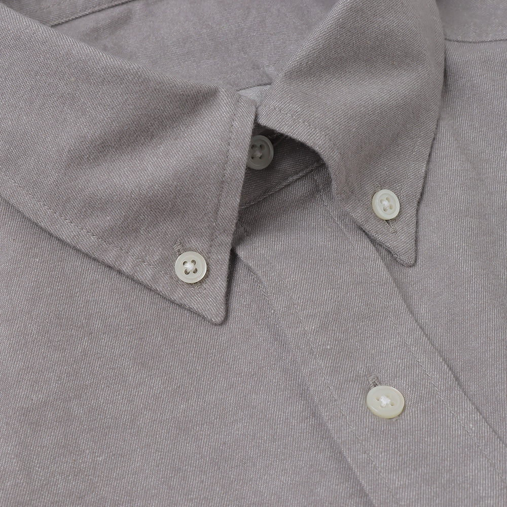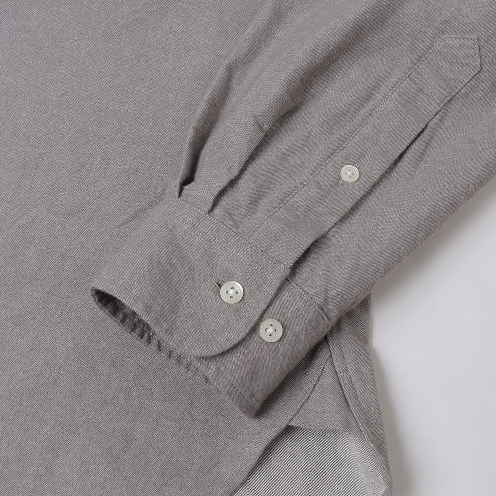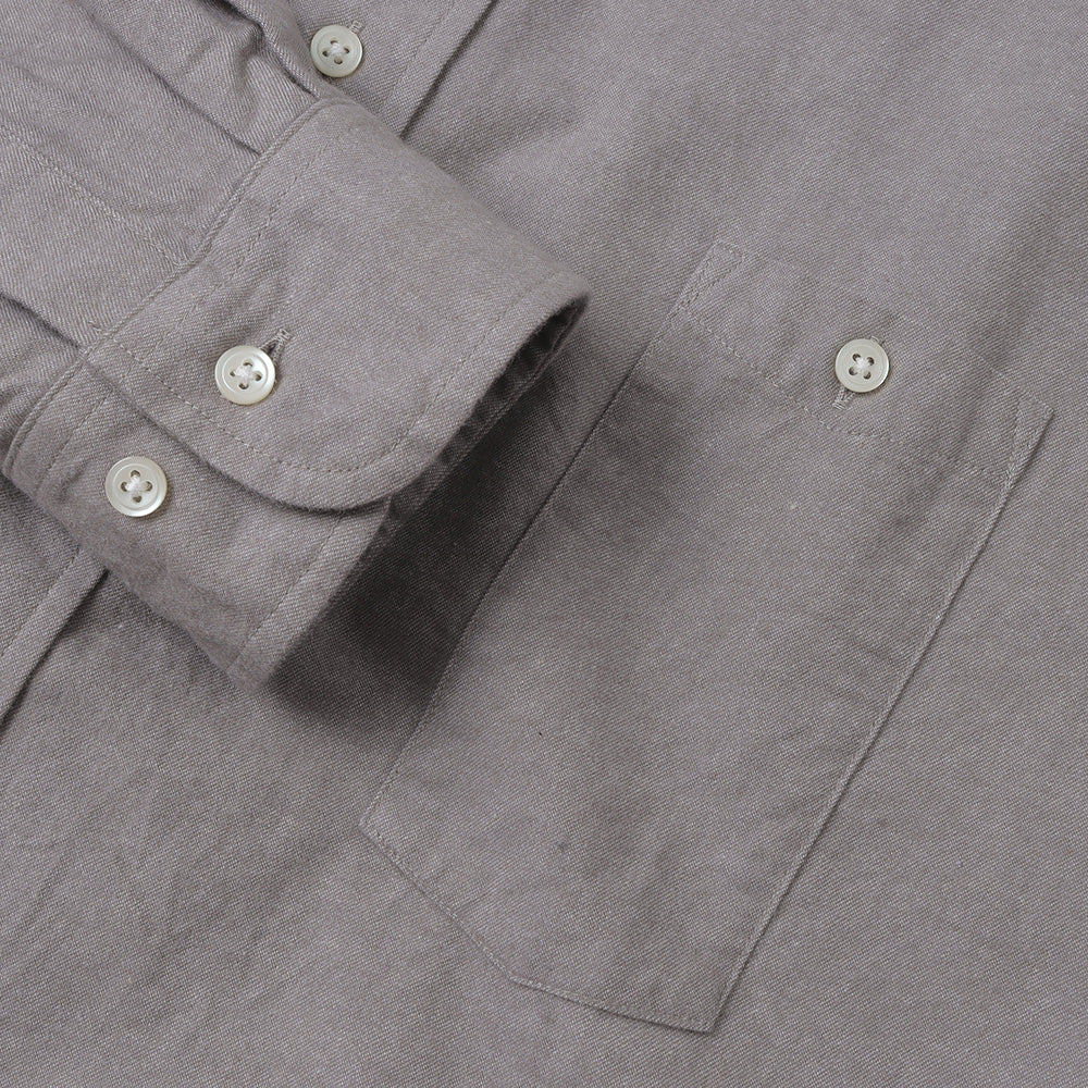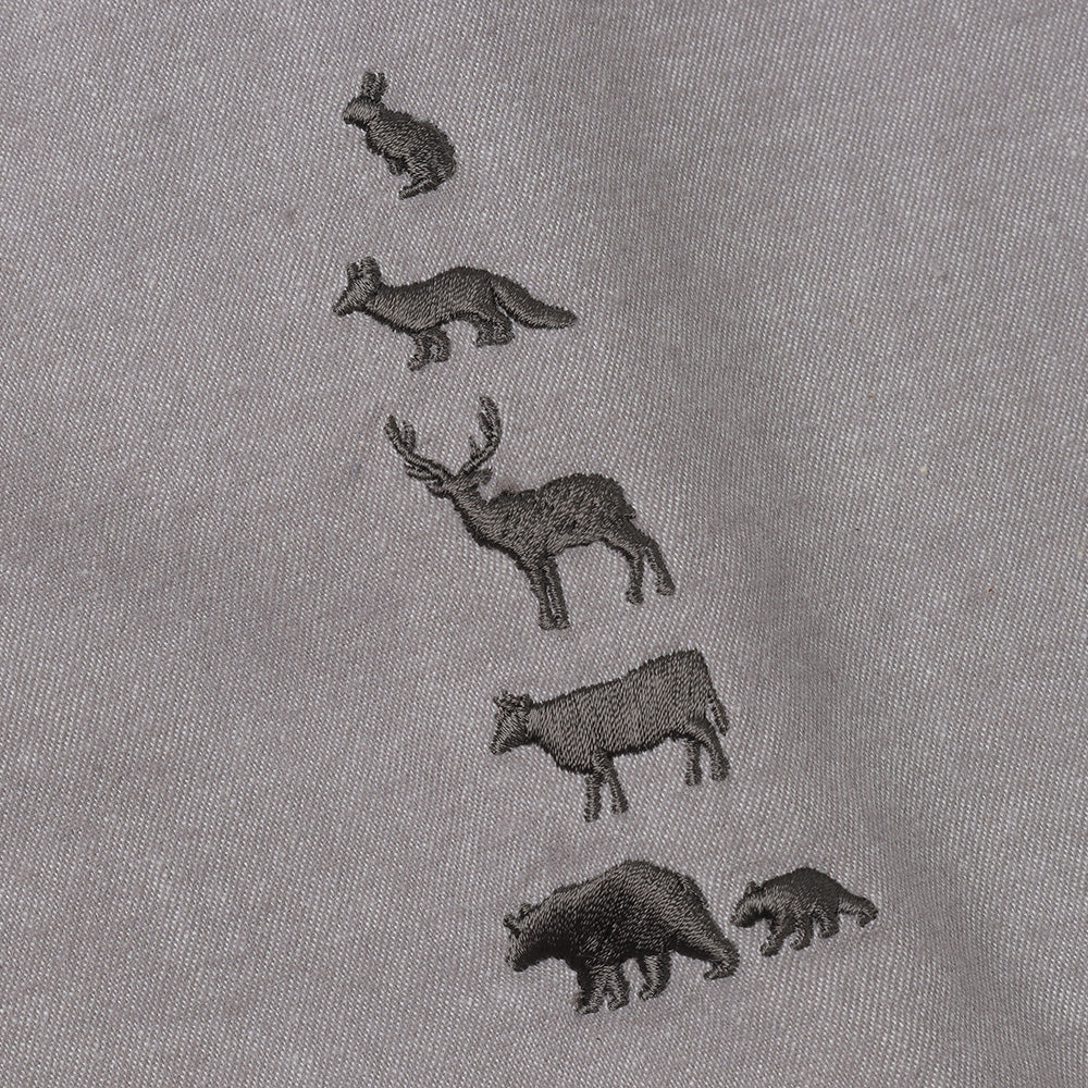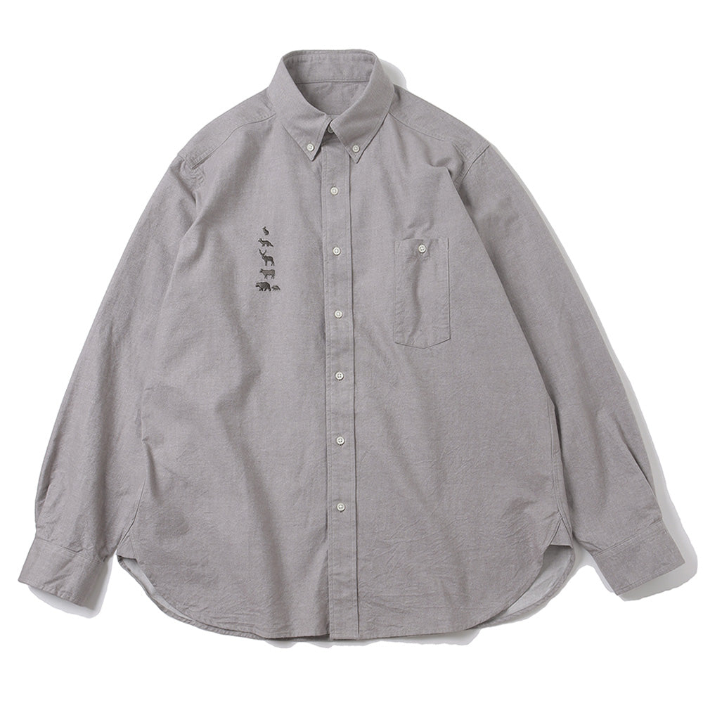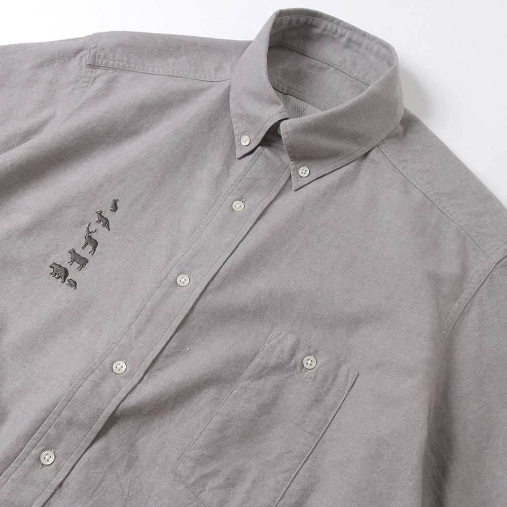 おなじみの動物刺繍シャツ。いつもとはひと味異なる起毛オックスならではの温かみあふれる生地のテクスチャーと細長プロポーションのワンボタン留めポケットがちょっぴり珍しい仕様。