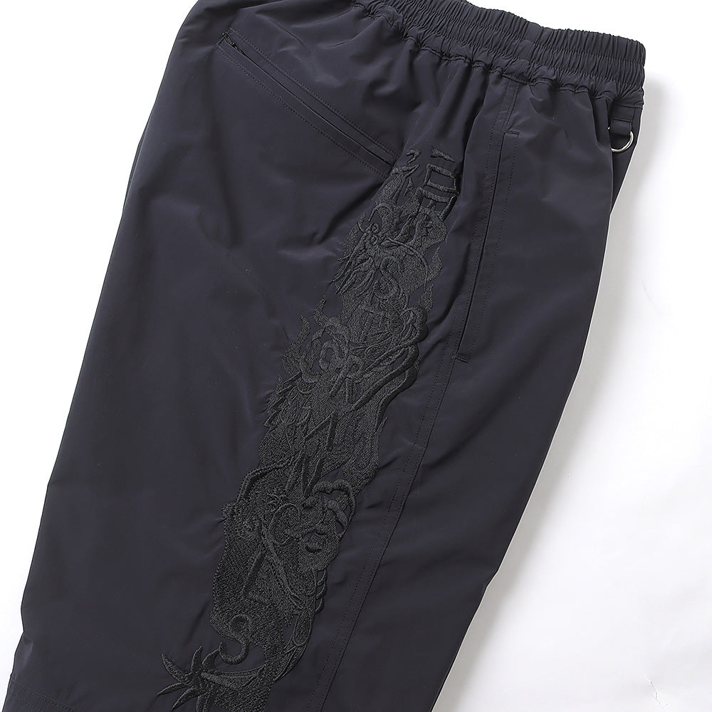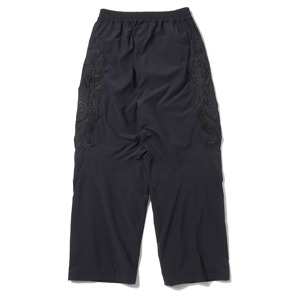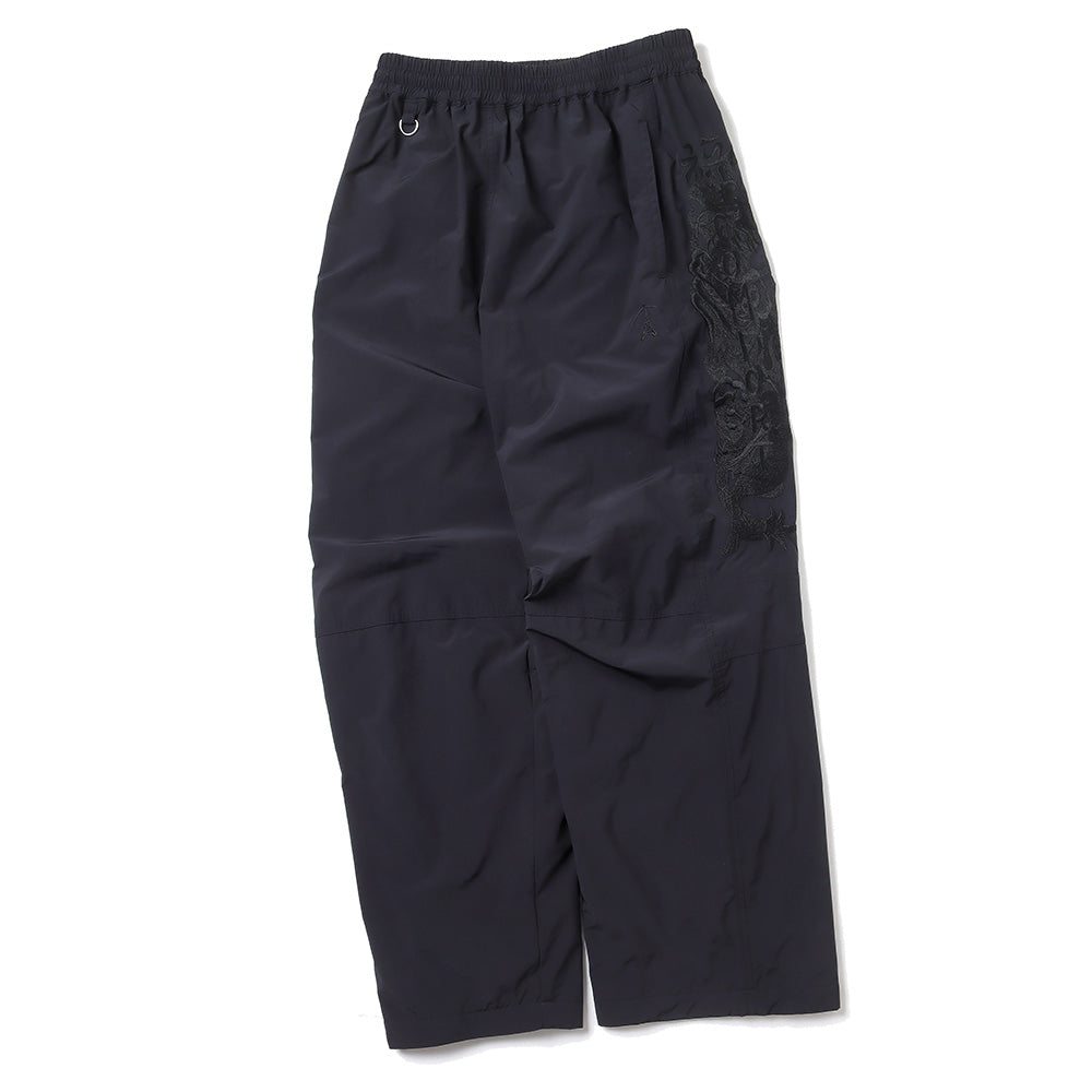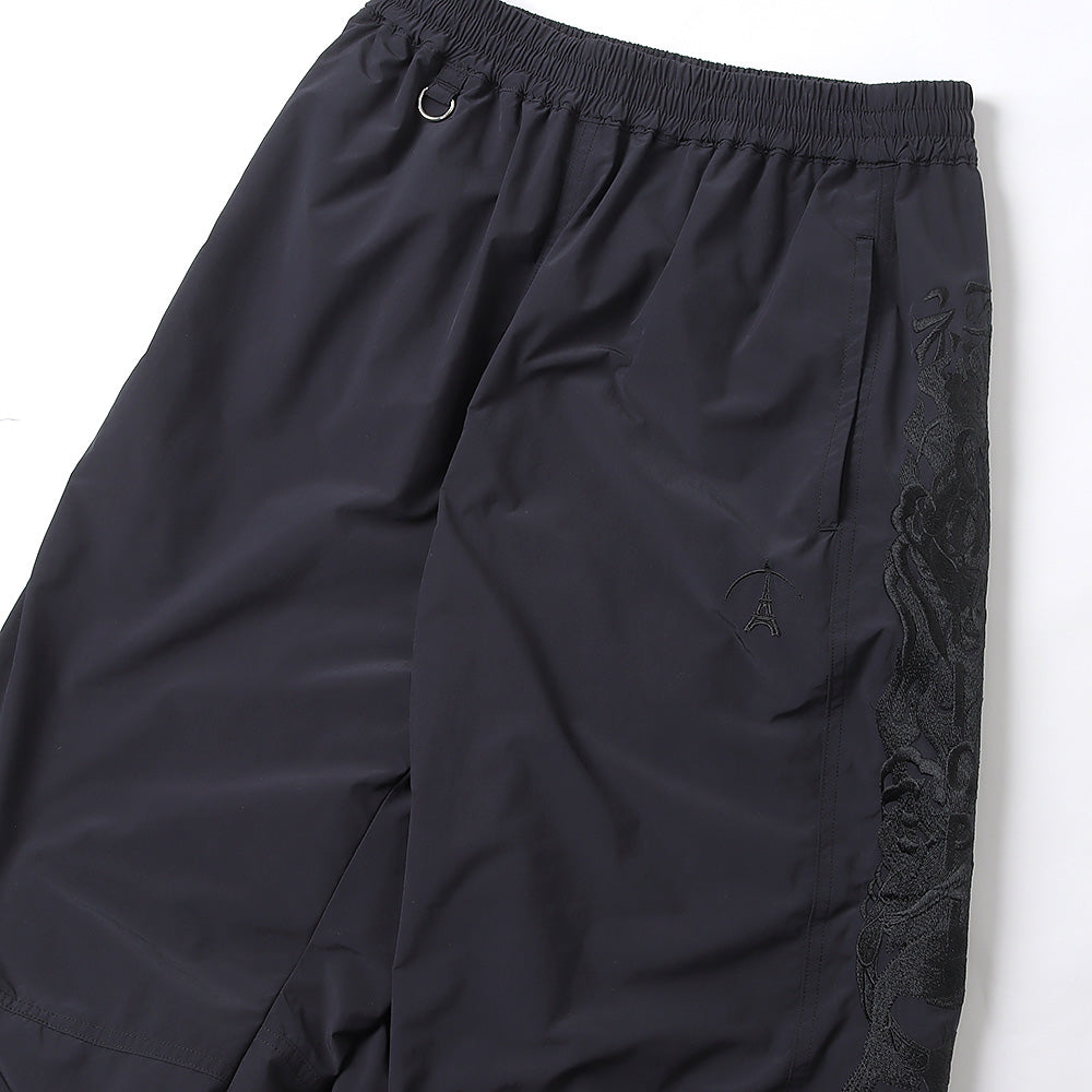 上品な光沢感としっとりと柔らかいピーチタッチの表面感が出るポリエステルナイロンの割繊糸で織ったルーズシルエットのトラックパンツ。