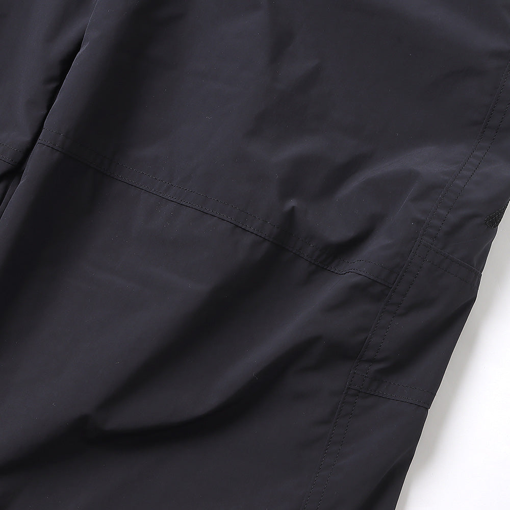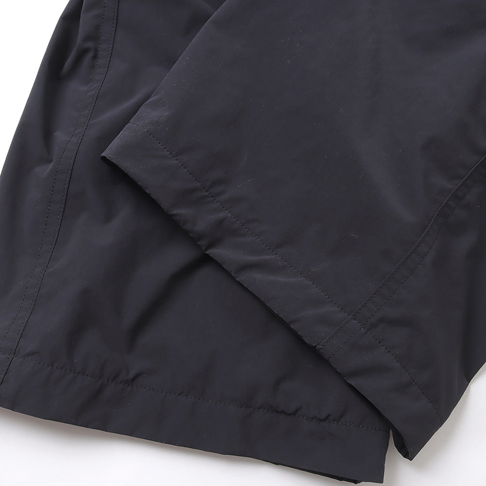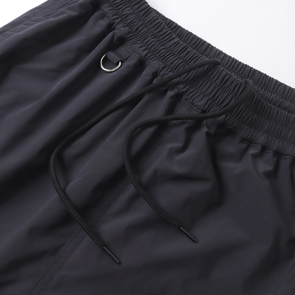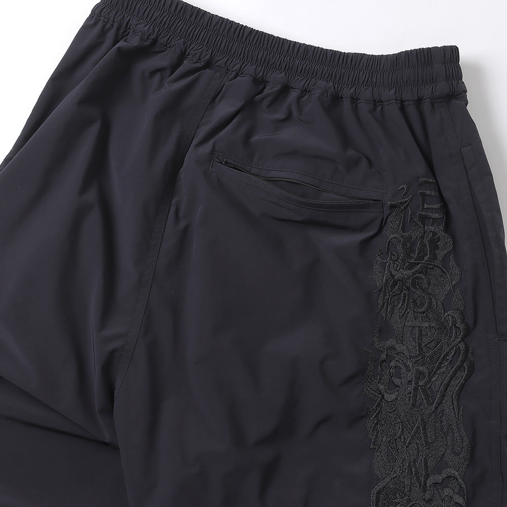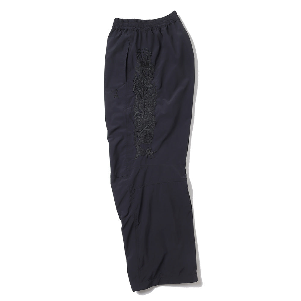 上品な光沢感としっとりと柔らかいピーチタッチの表面感が出るポリエステルナイロンの割繊糸で織ったルーズシルエットのトラックパンツ。