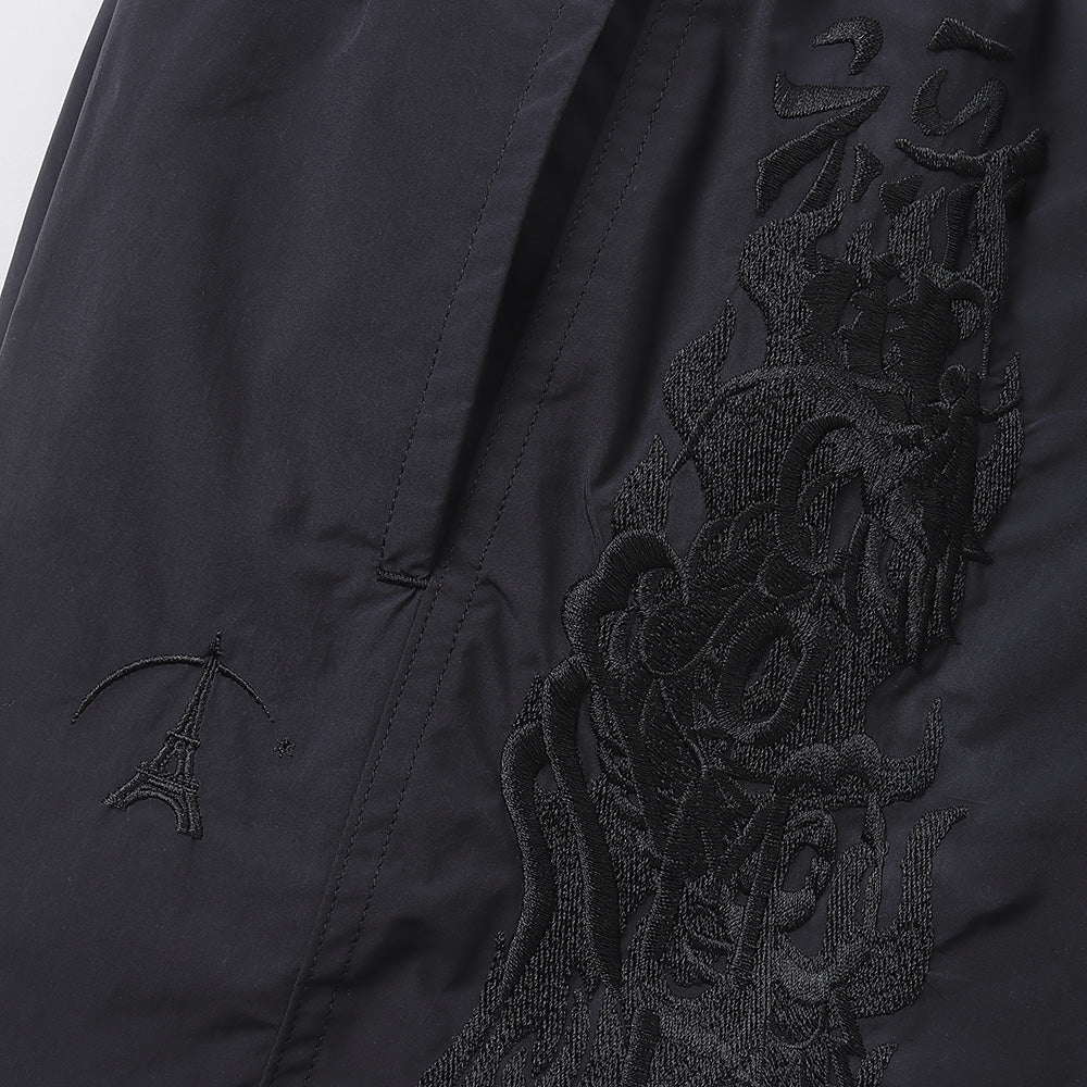 背中にはスカジャンなどの様々なモチーフの刺繍がカオスに重なり合っているdoubletの代名詞のカオス刺繍を身生地同色で施しています。パッと見はシンプルそうでありながら背中の立体感のある刺繍の強さを楽しんでもらえたら嬉しいです。