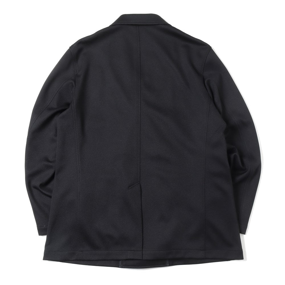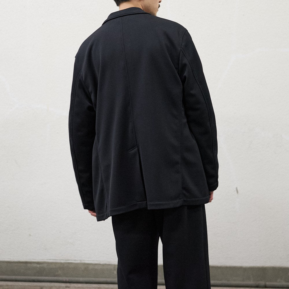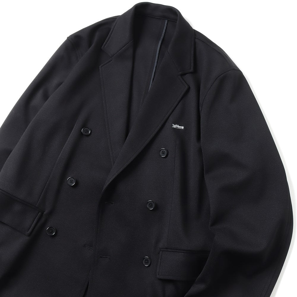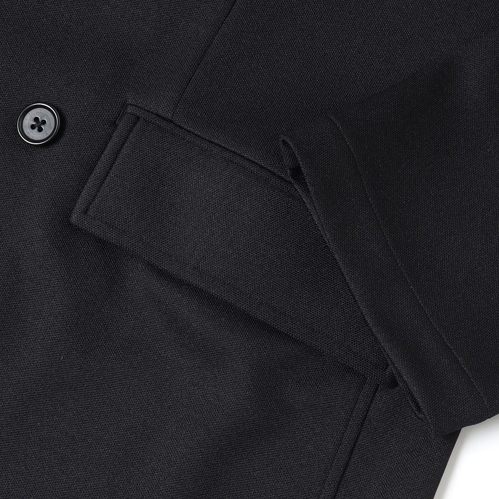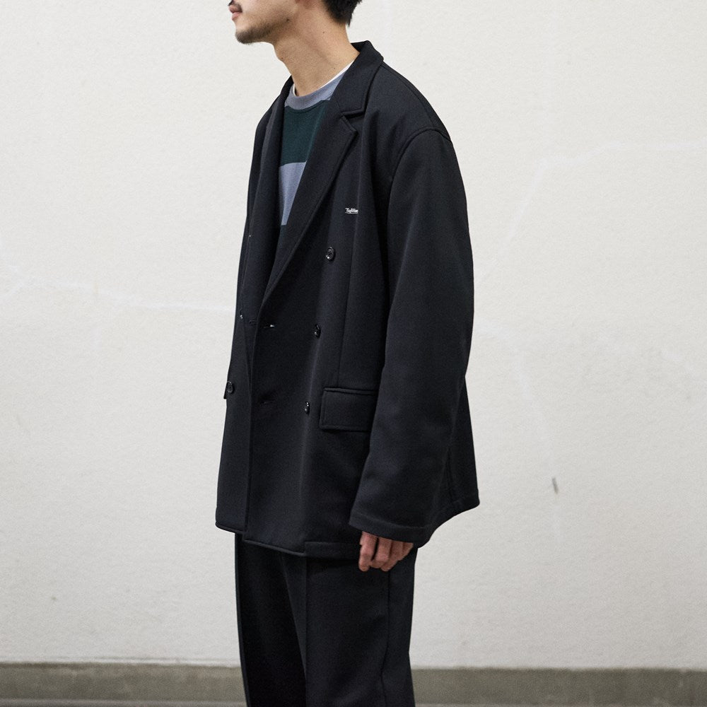 クラシックな雰囲気のダブルブレストのジャケット・ブレザーをデザインベースに、ケアのしやすさ・優れた伸縮性に加え、クリーンな表情に仕上げた高密度ジャージー素材を使用。