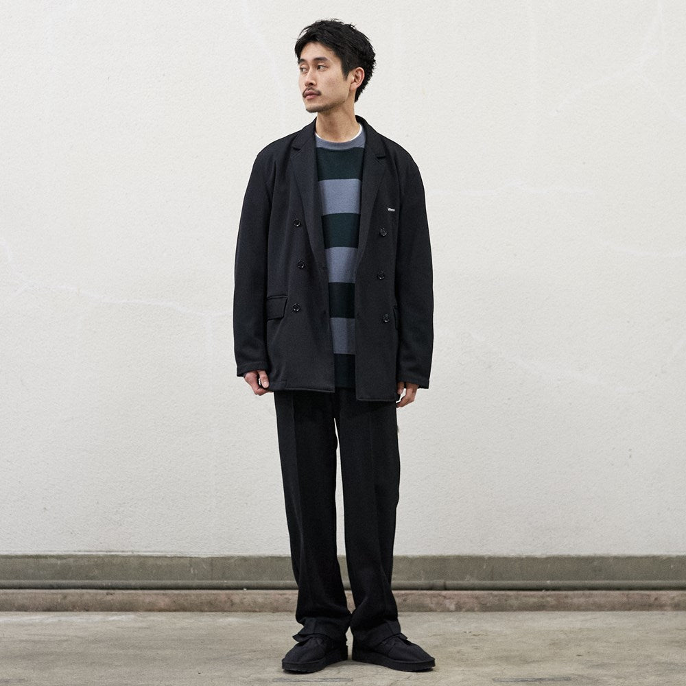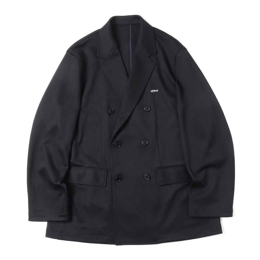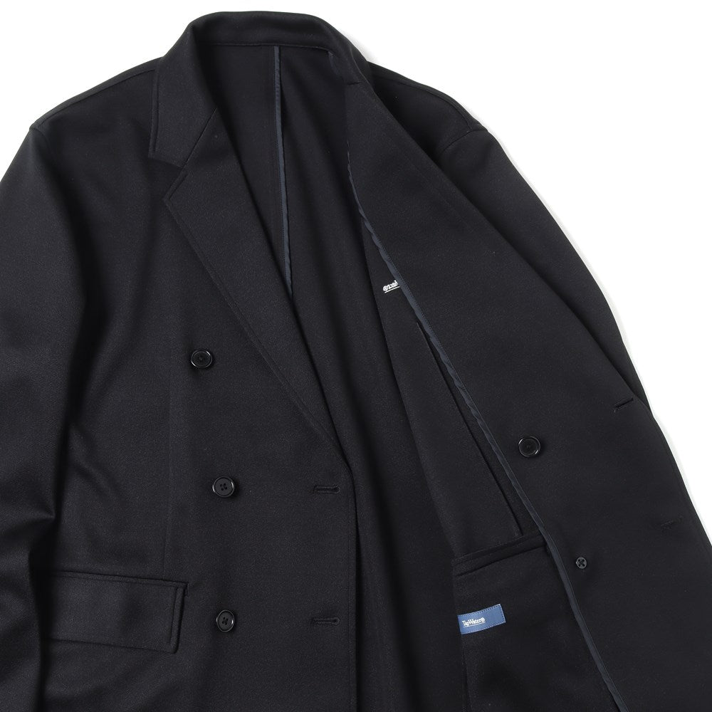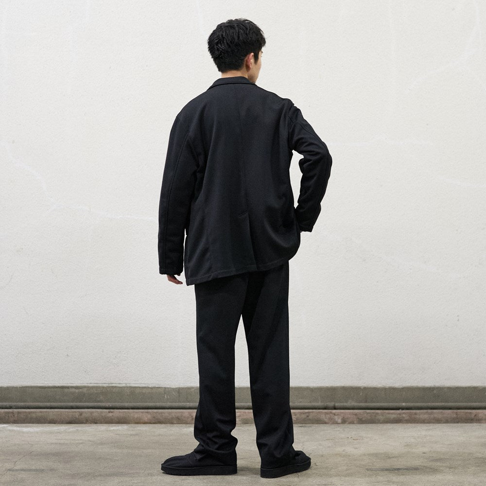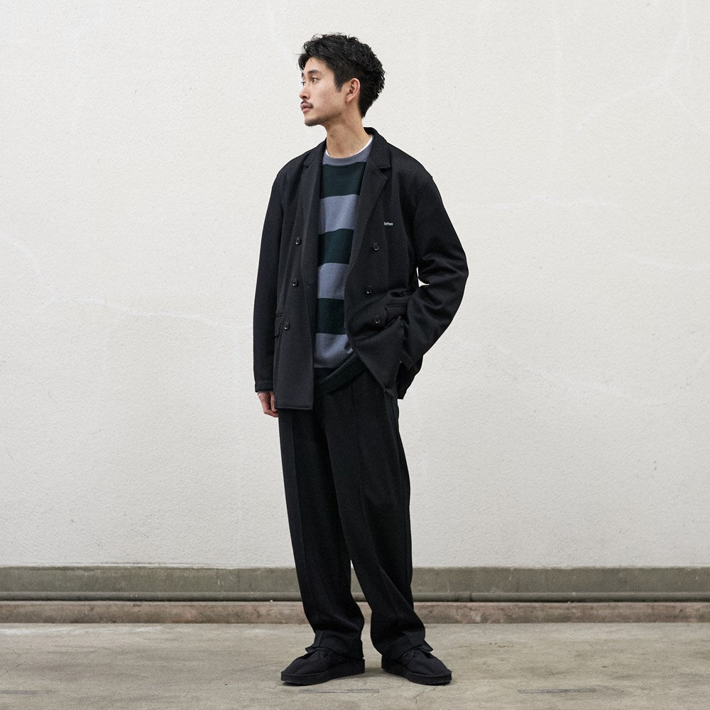 クラシックな雰囲気のダブルブレストのジャケット・ブレザーをデザインベースに、ケアのしやすさ・優れた伸縮性に加え、クリーンな表情に仕上げた高密度ジャージー素材を使用。