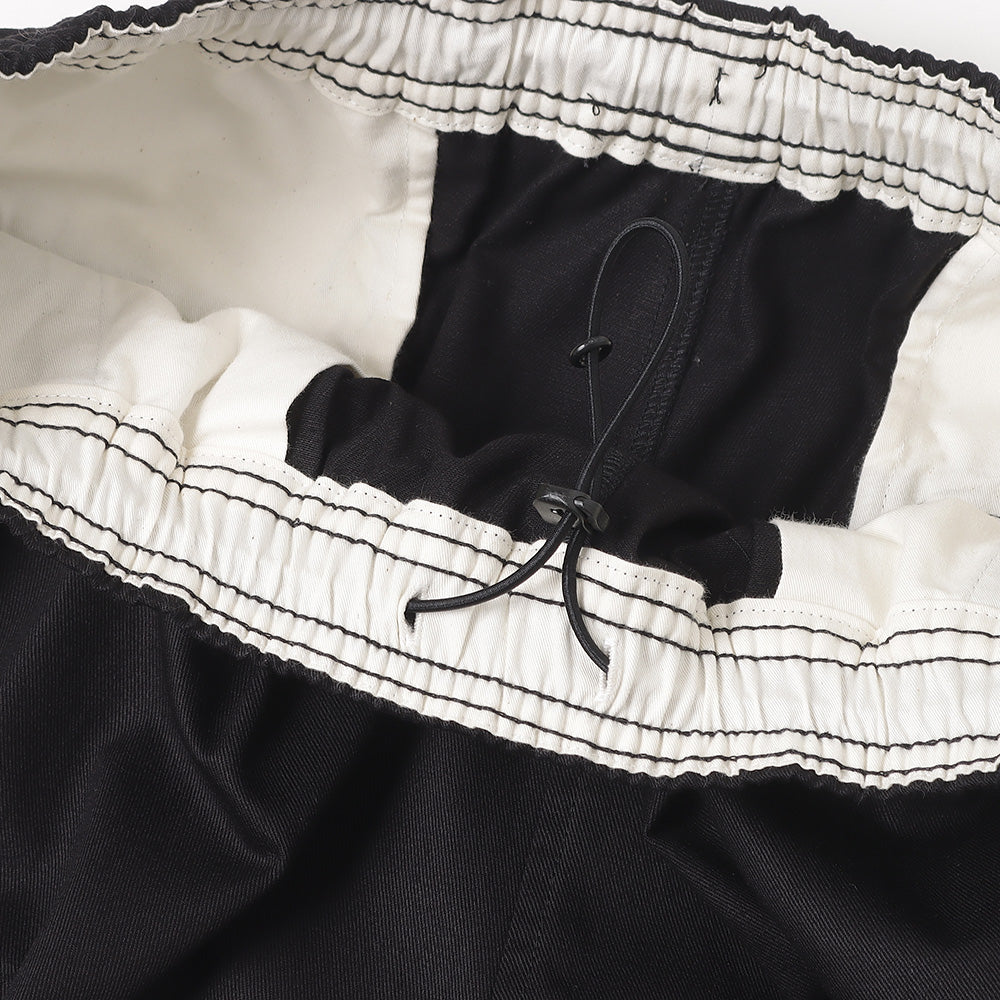 架空の配送業者のユニフォームをイメージしたチノトラウザー。太番手で織り上げたドライな質感のチノ素材は耐久性に優れ、使い込む程に身体に馴染むワークテイスト溢れるファブリック。イージーパンツのようなゴム仕様のウエストと2本のタックがボリュームのある腰回りを。裾に向かってスッキリとテーパードさせたシルエット。洗濯のし易さは勿論、カジュアルでクリーンな着こなしに抜群の1本。