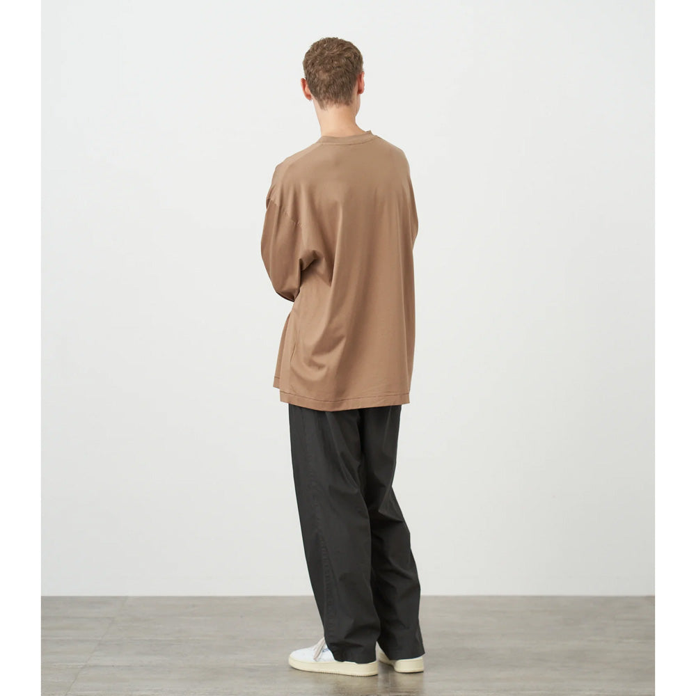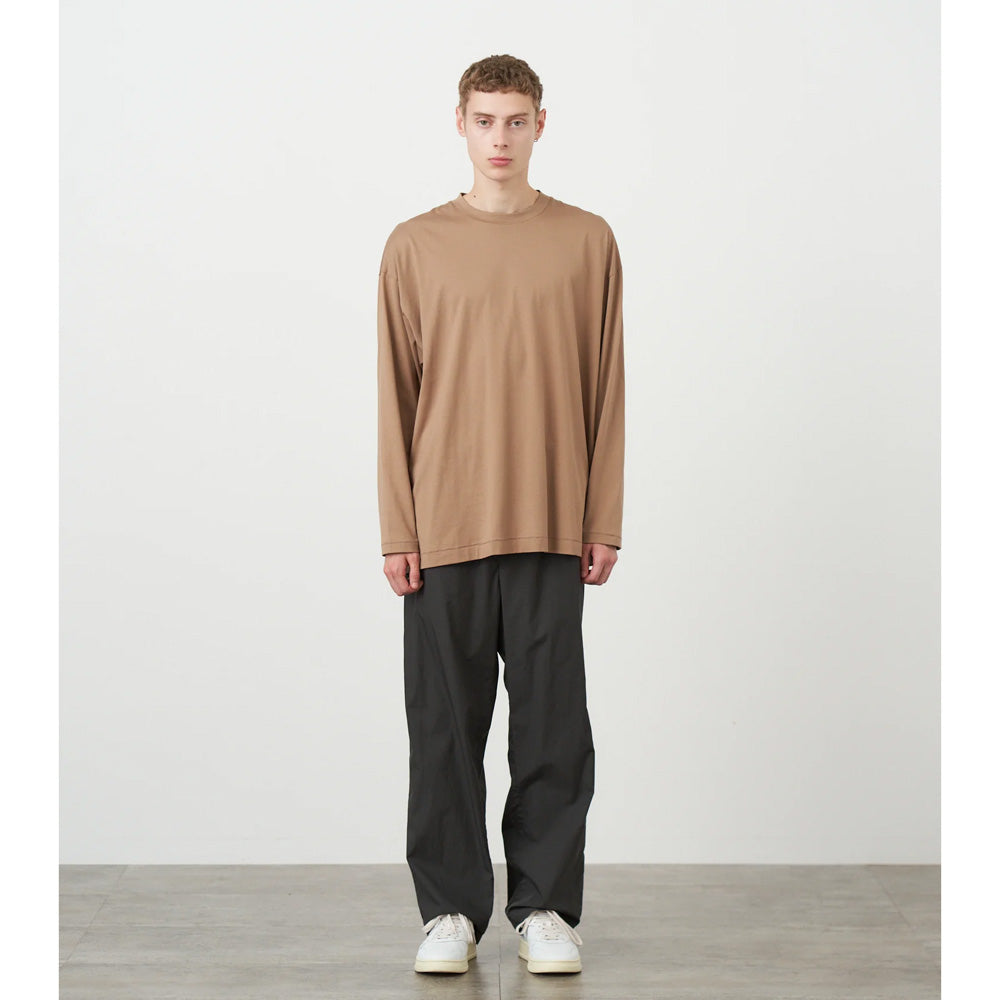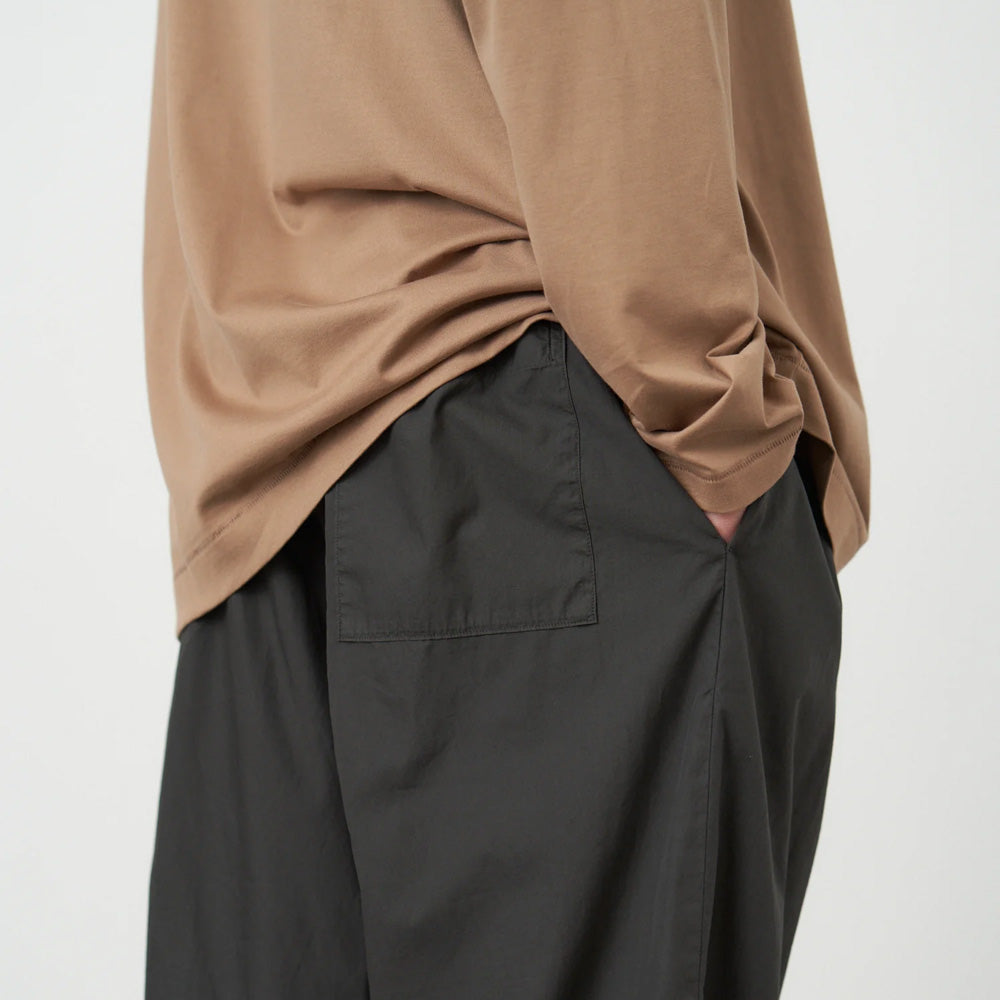 ゆったりとしたワイドテーパードシルエットでリラックス感があり、様々な靴とも相性が良い1着です。ベルト内側に紐が通っているので、表に紐を出さず調節し、