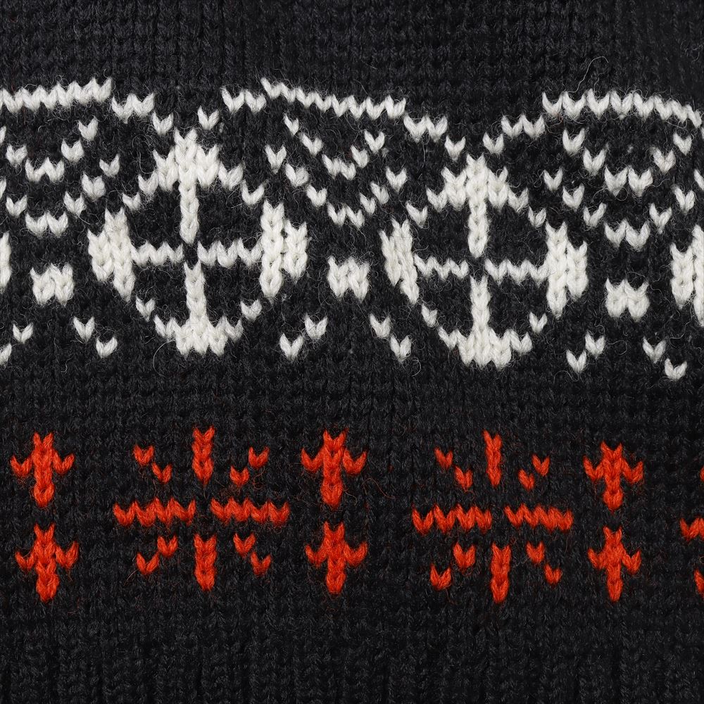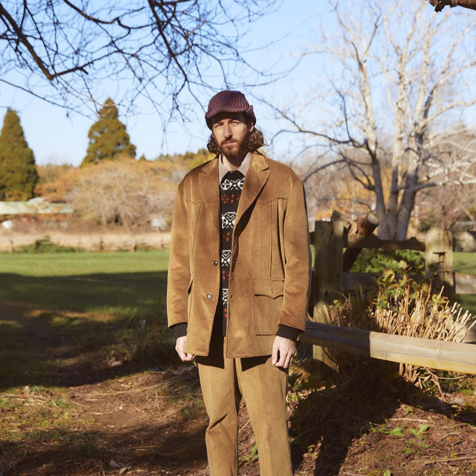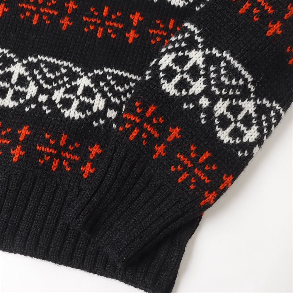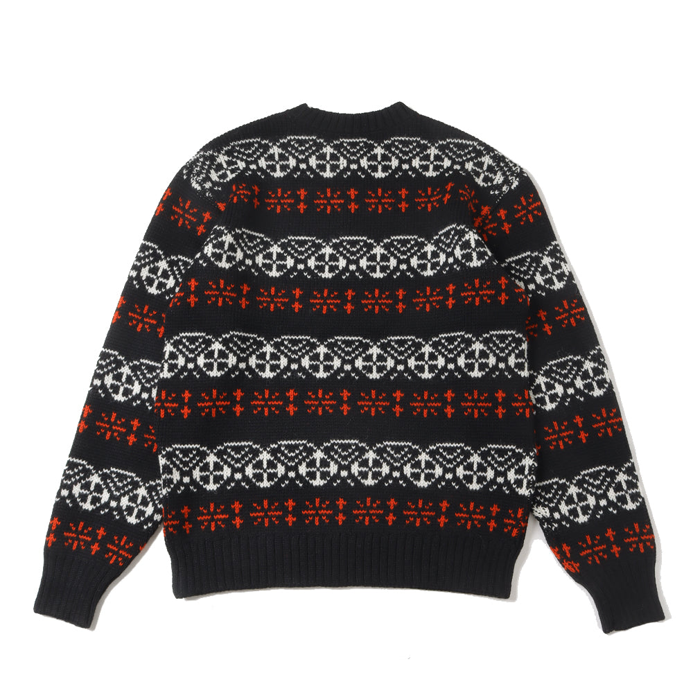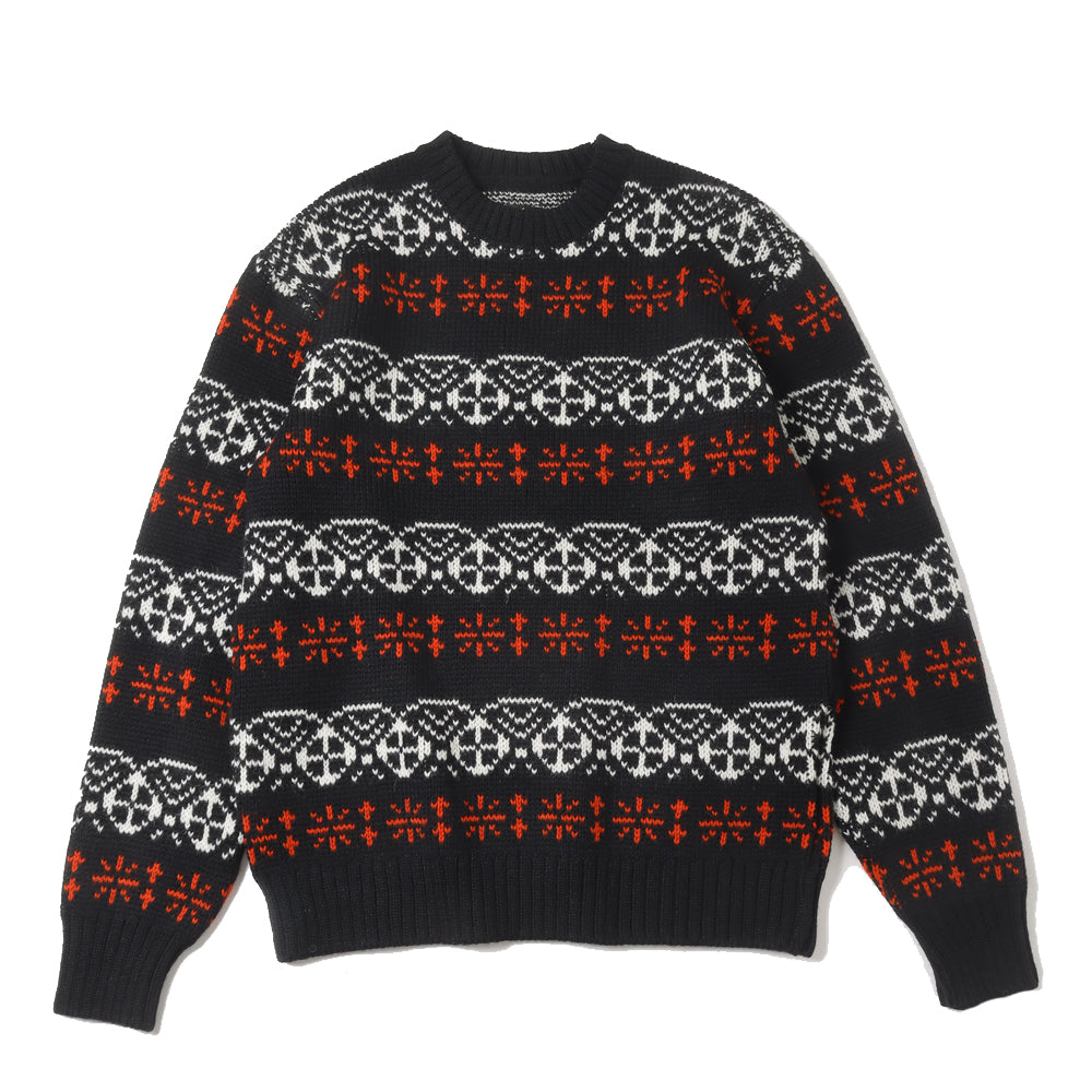 温かみを感じさせるオーセンティックな総柄ニットが目を引く一着。