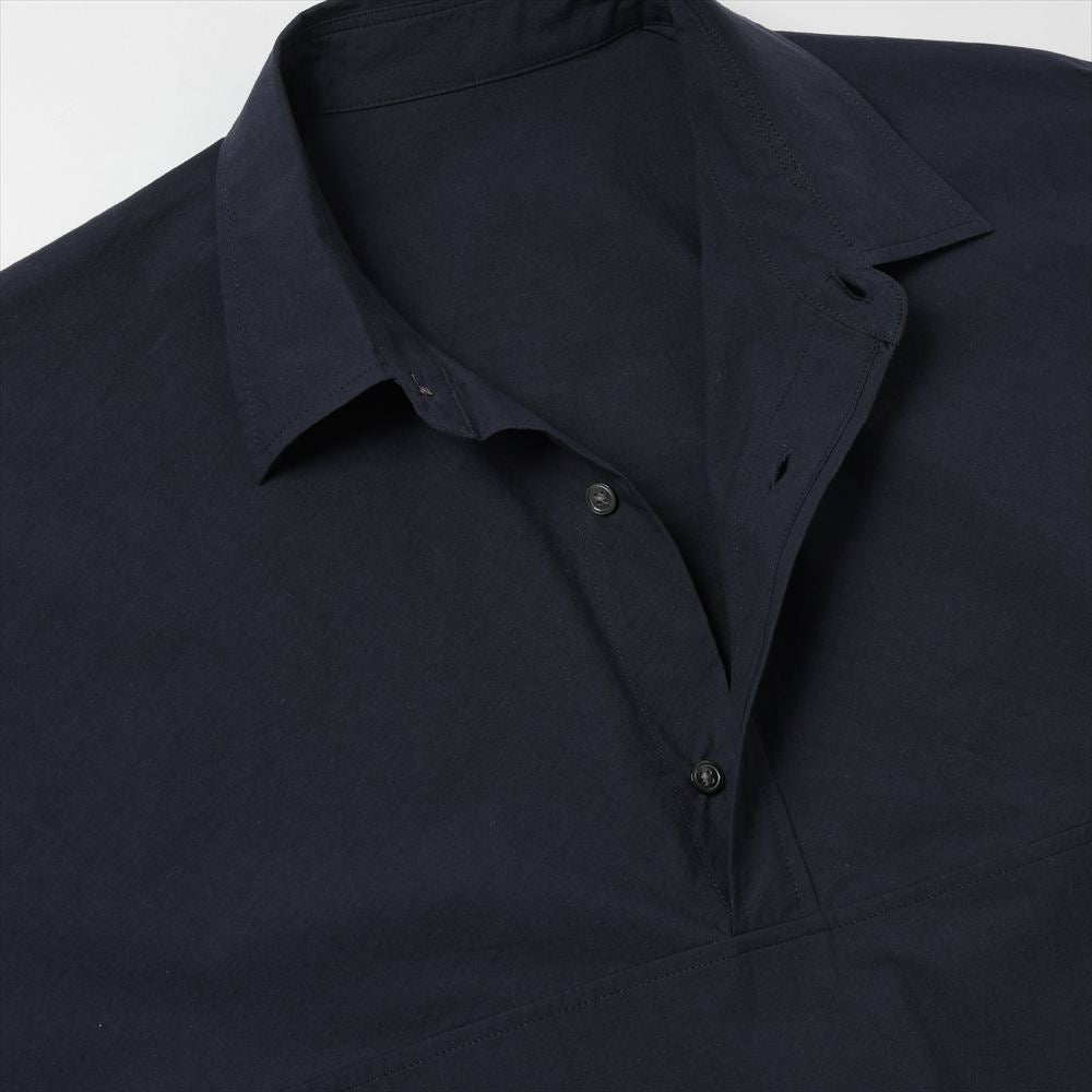 軽さが特徴のコットンポプリンを使用したショートスリーブプルオーバーシャツ。ナチュラルなシワ感がこなれた雰囲気を生み、着用を重ねるごとに風合いが増す。両脇にはシームポケットを配置し、利便性も確保。裾にはドローコードを配してシルエット調整も自在に。シャツの上品さとアノラックの機能性を掛け合わせたデザインは、街にもフィールドにもフィットする汎用性の高い一枚。