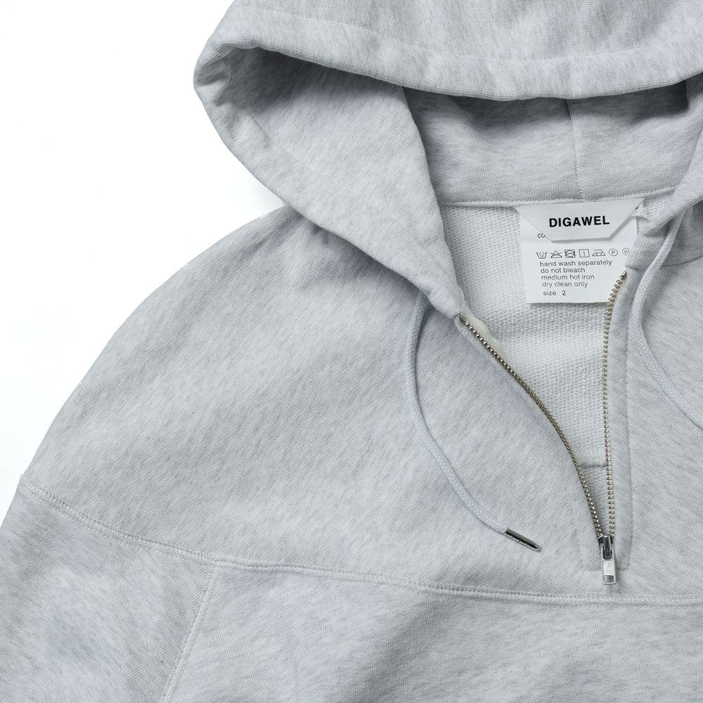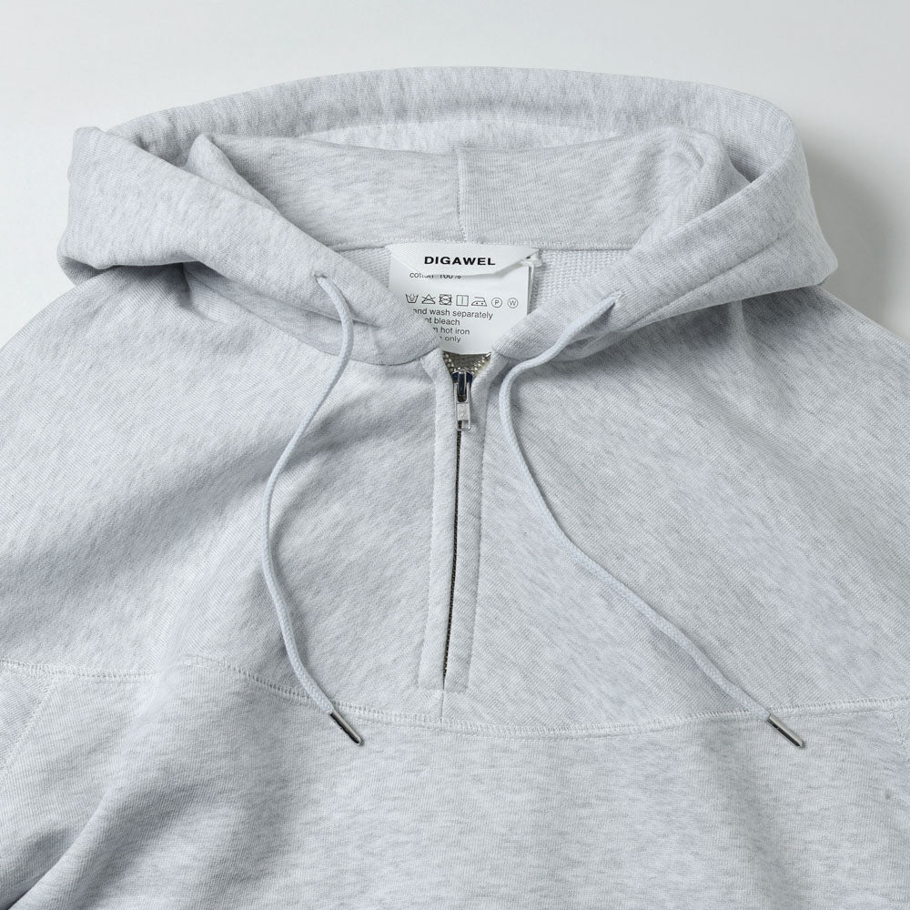 ハーフジップの裏毛スウェットフーディ。胸元から肩、背中と一直線に入れた切り返しの入ったカップショルダー。