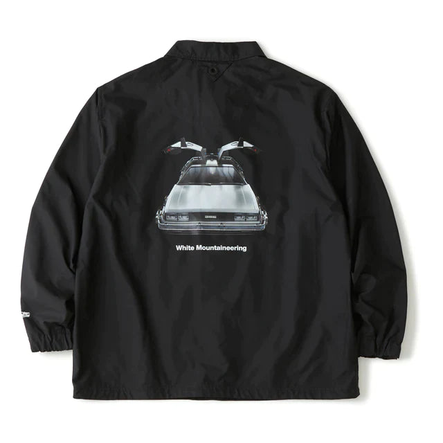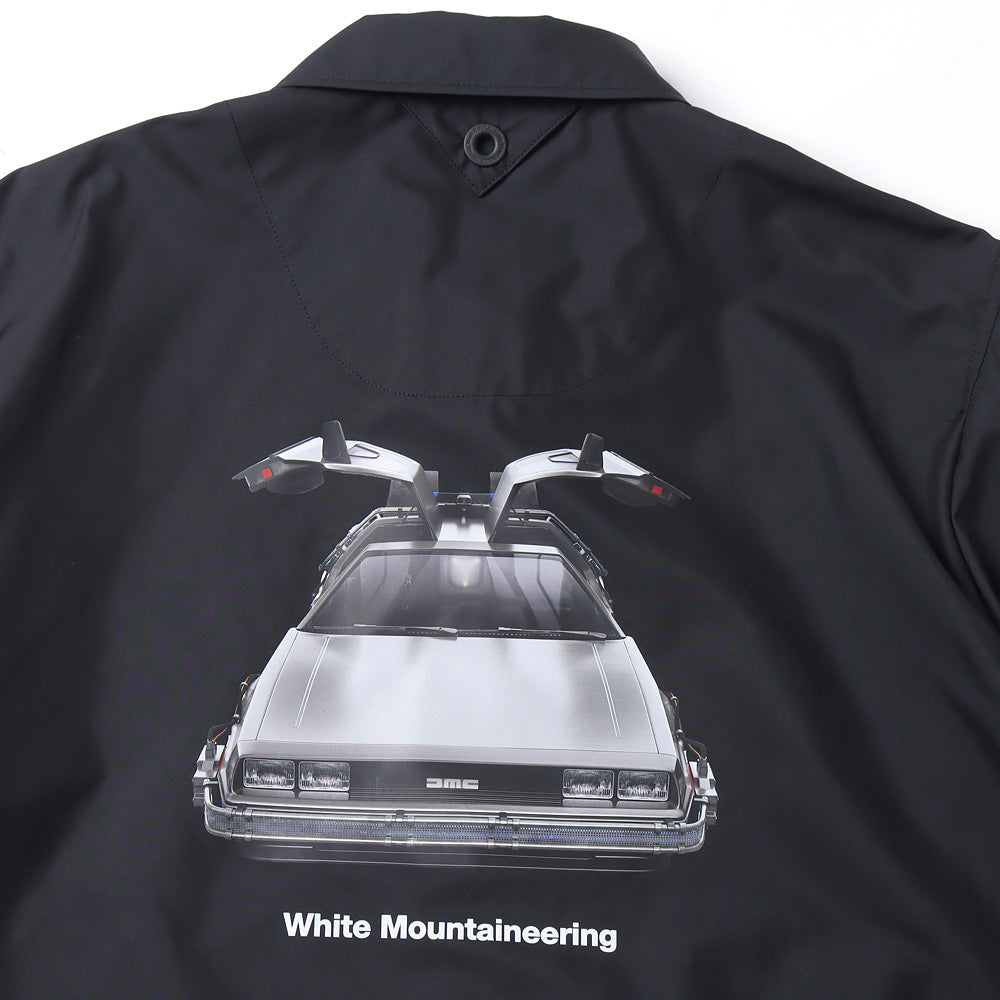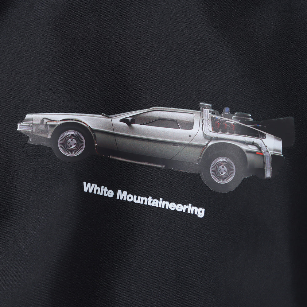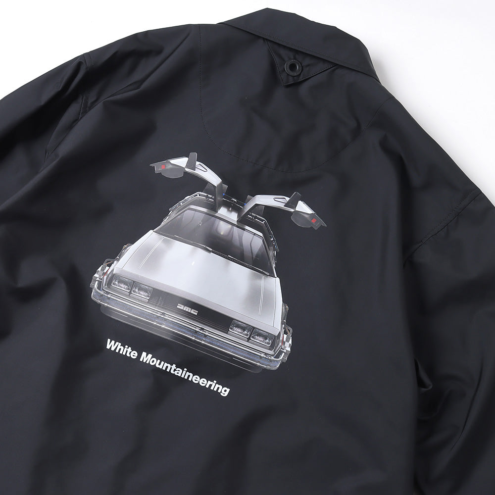 映画"Back to the future"コラボレーションのWMコーチJKT。アイコンであるデロリアン(DMC-12)のグラフィックを大胆にプリント。高密度に織り上げたツイル素材。緯糸に高捲縮糸を使用しておりポリウレタンを使用したようなストレッチ性が有ります。ケマーズ社のテフロン撥水加工を施しており、耐久撥水性・撥油性・防汚性を発揮する素材です。
